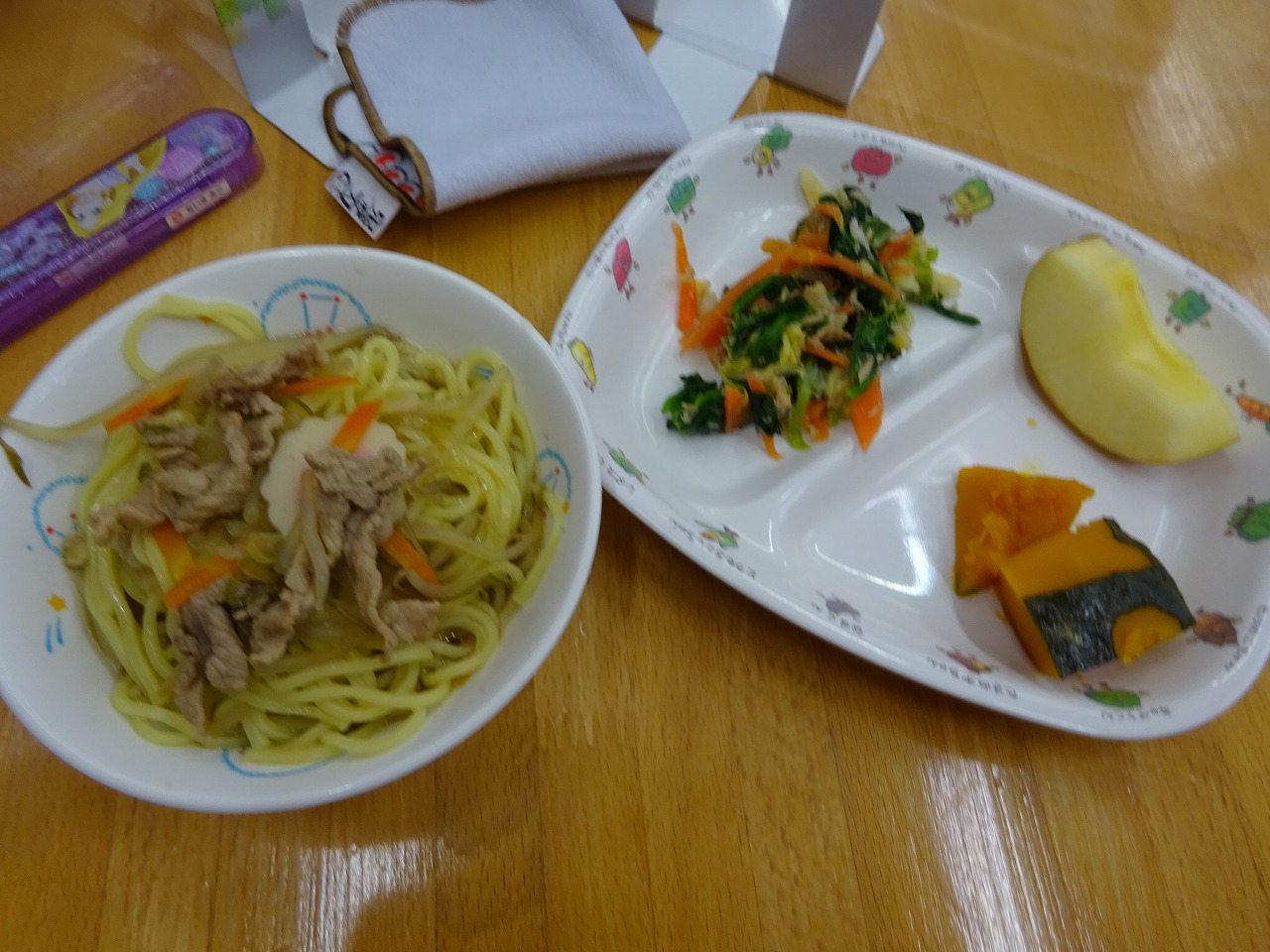 11月22日(月)給食 ・しょうゆラーメン(中華麺・豚肉・なると・もやし・にんじん・ねぎ) ・かわりおひたし(ほうれん草・キャベツ・にんじん・ツナ) ・かぼちゃの甘煮 ・りんご