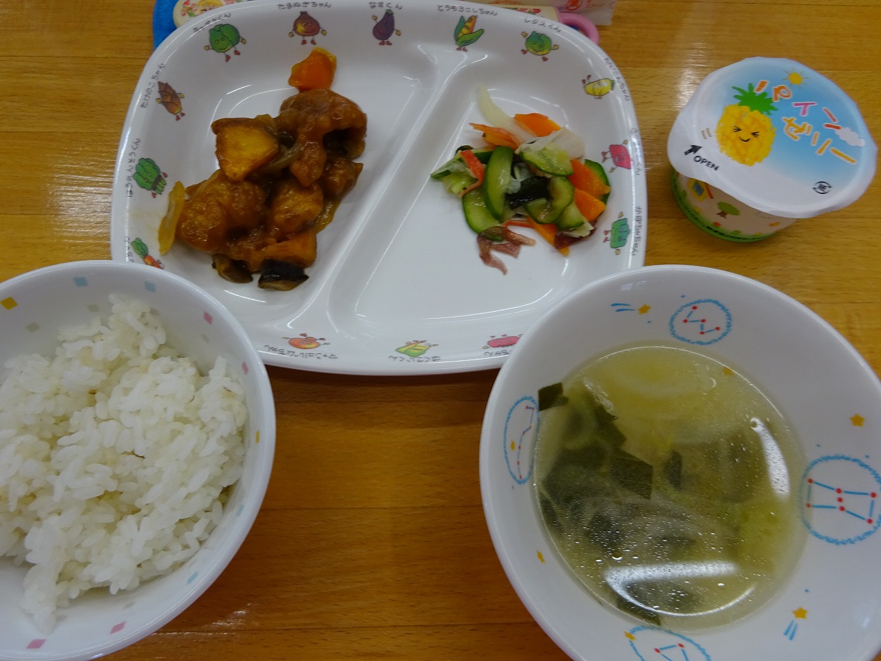 9月8日(水)給食 ・ごはん ・酢豚(豚肉・さつまいも・玉ねぎ・にんじん・ピーマン・干ししいたけ) ・海藻サラダ(海草・キャベツ・きゅうり・にんじん・カニカマ) ・ABCスープ(マカロニ・チンゲン菜・玉ねぎ・もやし・ねぎ) ・パインゼリー