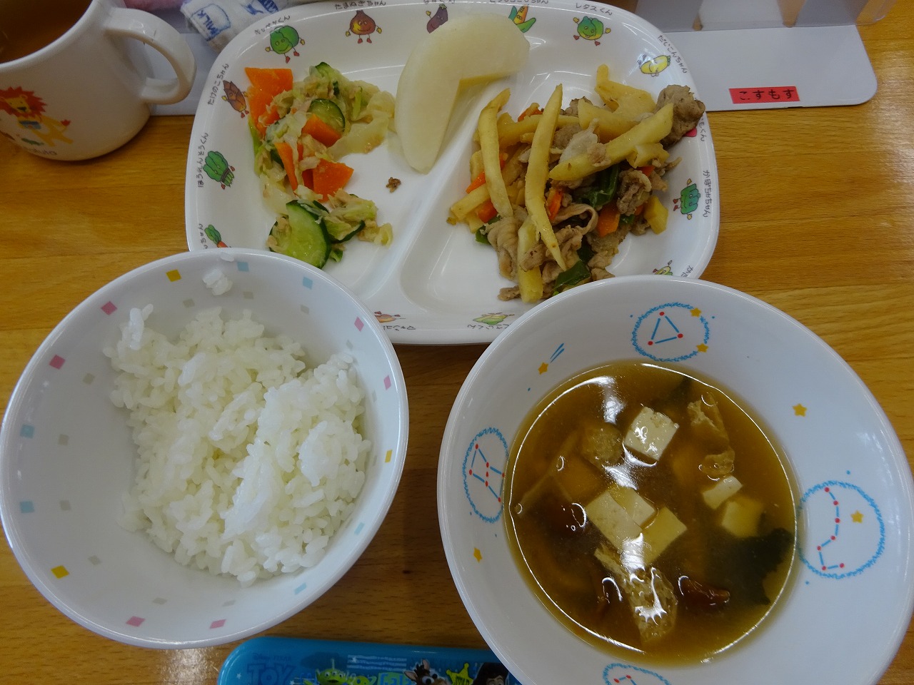 9月14日(火)給食 ・ごはん ・豚肉とピーマンの炒め物(豚肉・ピーマン・にんじん・たけのこ・フライドポテト) ・ツナサラダ(ツナ・キャベツ・きゅうり・にんじん) ・みそ汁(豆腐・油揚げ・なめこ・玉ねぎ・わかめ) ・なし