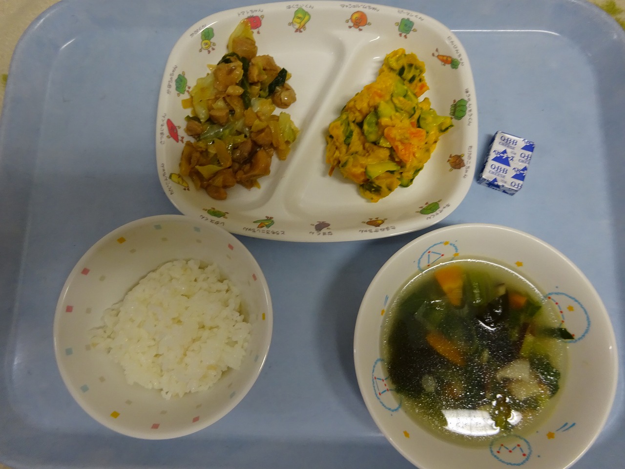 9月17日(金)給食 ・ごはん ・鶏ちゃん風炒め(鶏肉・キャベツ・玉ねぎ・ニラ) ・かぼちゃサラダ(かぼちゃ・きゅうり・にんじん・ハム・マヨ) ・コンソメスープ(こまつな・にんじん・しいたけ・ねぎ・わかめ) ・チーズ