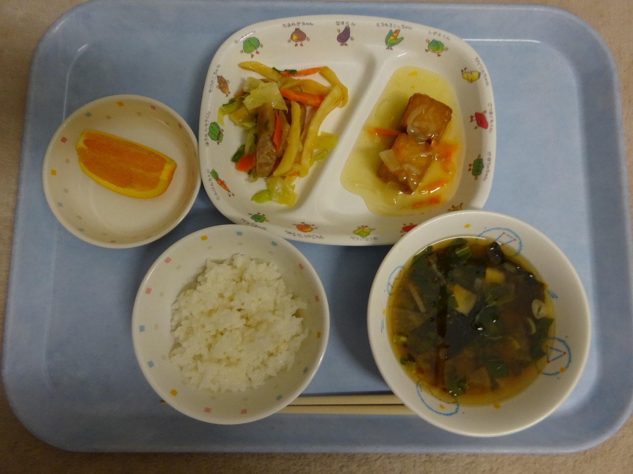 9月28日(火)給食 ・ごはん ・厚揚げの野菜あんかけ(厚揚げ・玉ねぎ・にんじん・ピーマン) ・いろどりソテー(ウインナー・キャベツ・玉ねぎ・にんじん・フライドポテト) ・みそ汁(だいこん・しいたけ・こまつな・ねぎ・わかめ) ・オレンジ