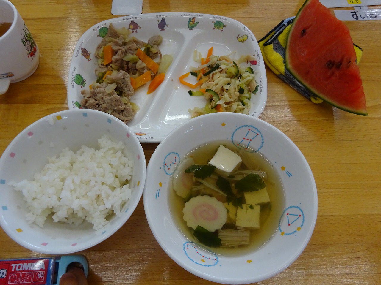 7月15日(木)給食 と おやつ ・ごはん ・豚肉の生姜焼き(豚肉・キャベツ・玉ねぎ・にんじん) ・切干大根のサラダ(切干だいこん・にんじん・きゅうり・ツナ) ・すまし汁(豆腐・なると・えのきたけ・ふ・三つ葉) ・スイカ おやつは、『フルーツゼリーあえ』 ゼリーの素でゼリーを作り、1㎝角くらいに切り、みかん(缶)・もも(缶)・パイン(缶) と混ぜました