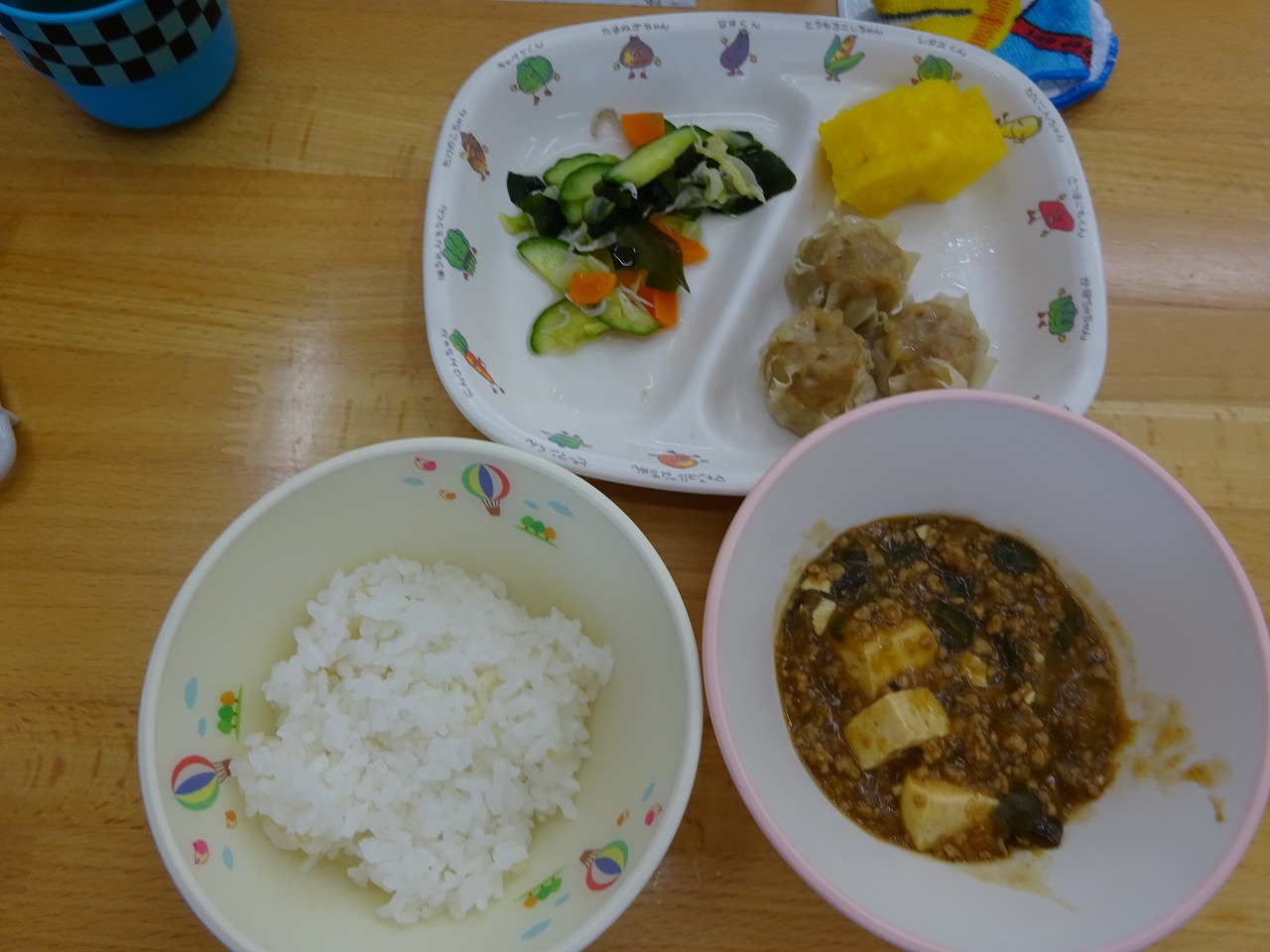 7月16日(金)給食 ・ごはん ・野菜たっぷりマーボー(豆腐・豚ひき肉・玉ねぎ・なす・トマト・ピーマン) ・きゅうりの酢の物(キャベツ・きゅうり・にんじん・しらす干し・わかめ) ・豚肉シューマイ ・パイナップル