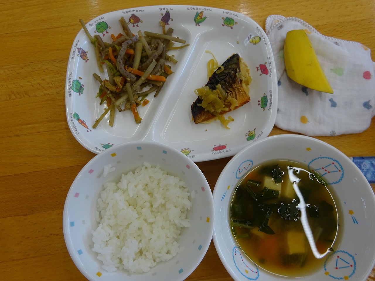7月20日(火)給食 ・ごはん ・さばの香味焼き(さば・ねぎ) ・五目きんぴら(ごぼう・にんじん・油揚げ・こんにゃく・さやえんどう) ・バナナ