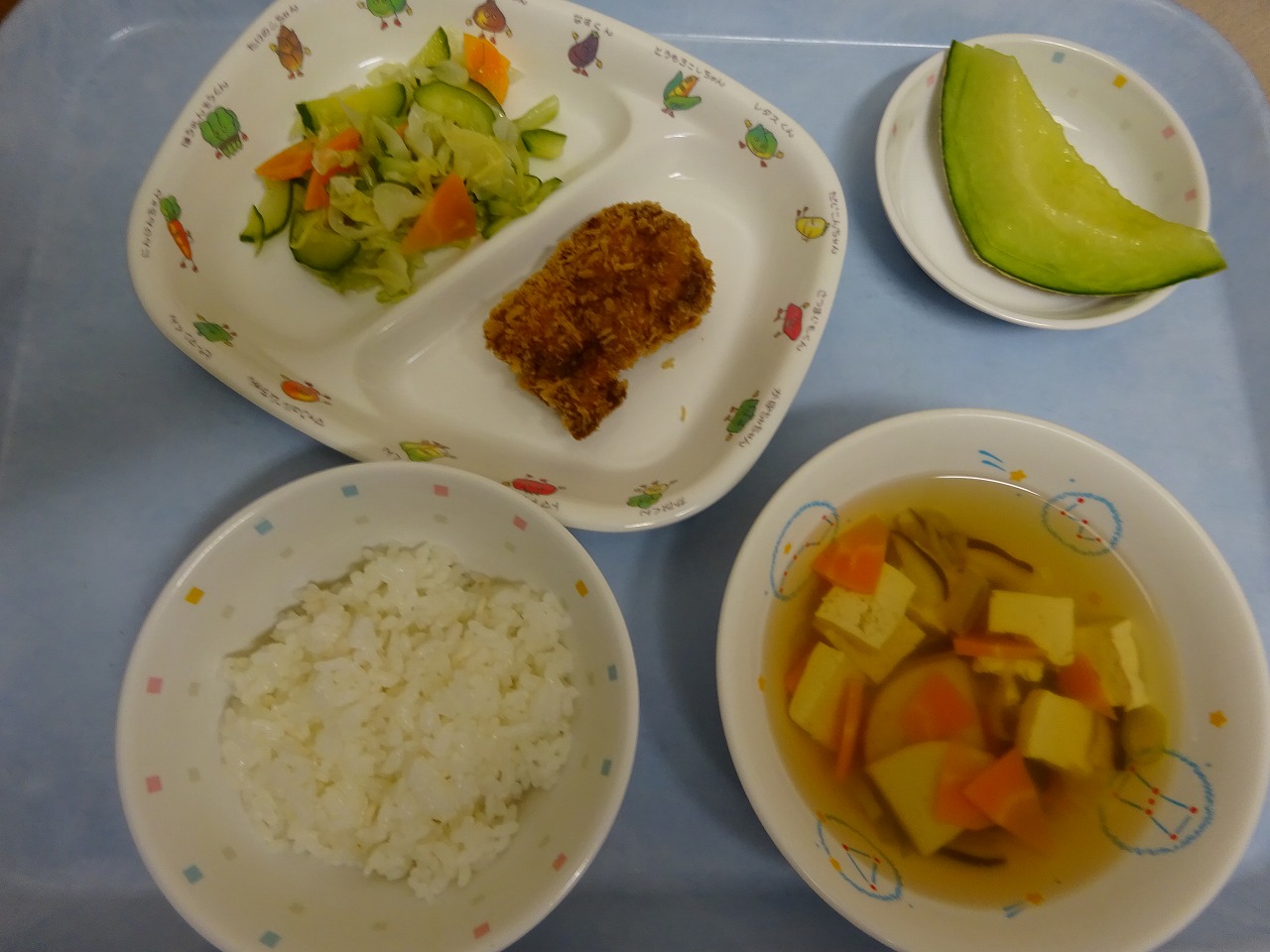 7月21日(水)給食 ・ごはん ・ヒレカツ(豚肉・卵・パン粉) ・キャベツのサラダ(きゃべつ・きゅうり・にんじん) ・すまし汁(豆腐・かまぼこ・にんじん・しいたけ・ねぎ) ・メロン