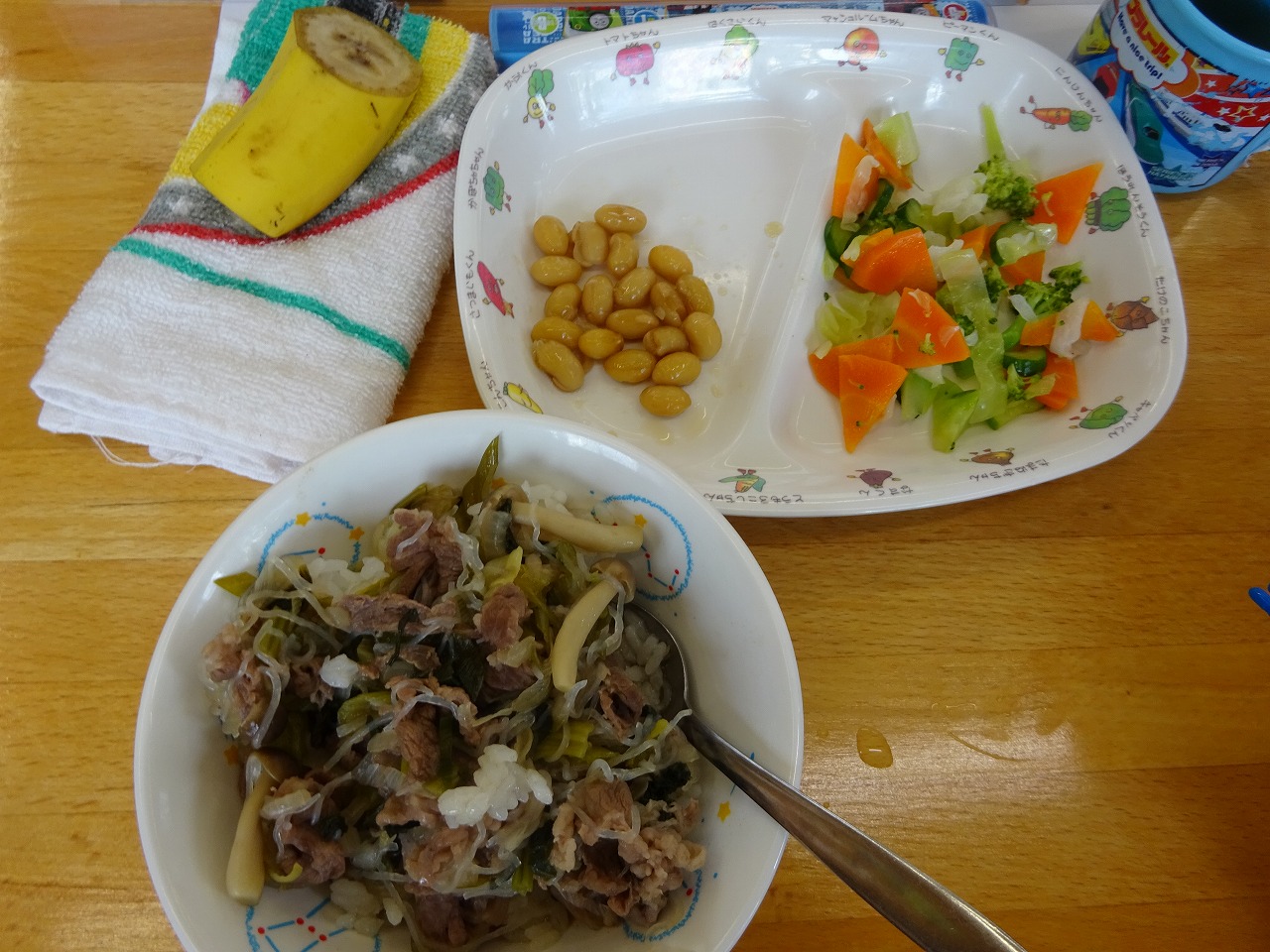 7月28日(水)給食 と おやつ ・牛丼(米・牛肉・玉ねぎ・小松菜・しらたき・ねぎ) ・フレンチサラダ(キャベツ・きゅうり・にんじん・ブロッコリー) ・大豆の甘煮 ・バナナ おやつは、『キャロットケーキ』 ホットケーキミックス、卵、バター、スキムミルク、水、にんじんのすりおろしを混ぜて、焼きました。