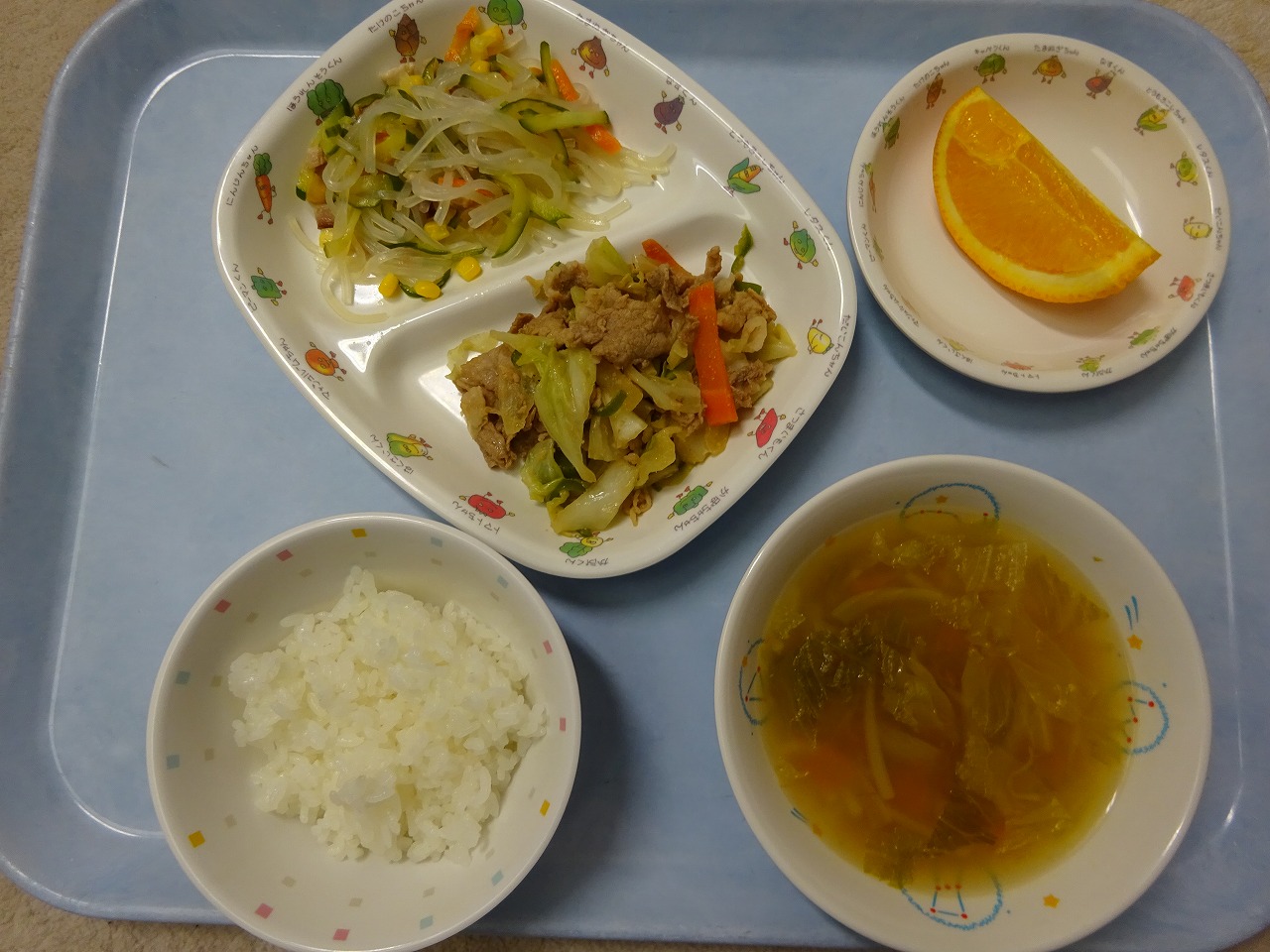 8月2日(月) 給食 ・ごはん ・豚肉の野菜みそ炒め(豚肉・キャベツ・玉ねぎ・にんじん・ピーマン・みそ) ・マロニーの中華あえ(マロニー・きゅうり・にんじん・ハム・コーン) ・レタススープ(レタス・トマト・玉ねぎ・もやし・しめじ) ・オレンジ
