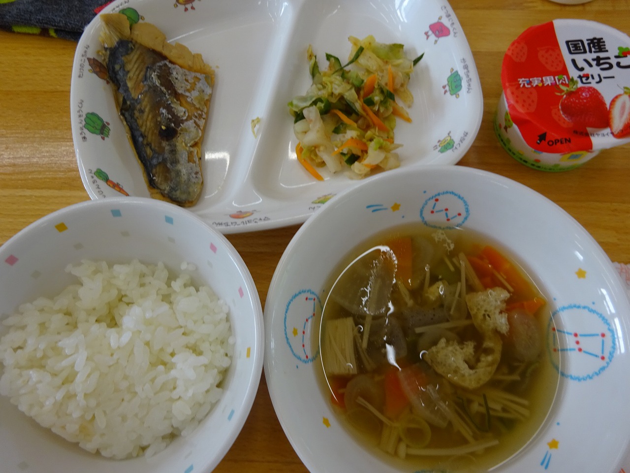 5月12日(水) 給食 ・ごはん ・わわらの西京焼き ・うめかつおあえ(キャベツ・きゅうり・にんじん・うめびしお・かつお節) ・たぬき汁(だいこん・にんじん・ごぼう・こんにゃく・えのきたけ・ねぎ・油揚げ) ・いちごゼリー