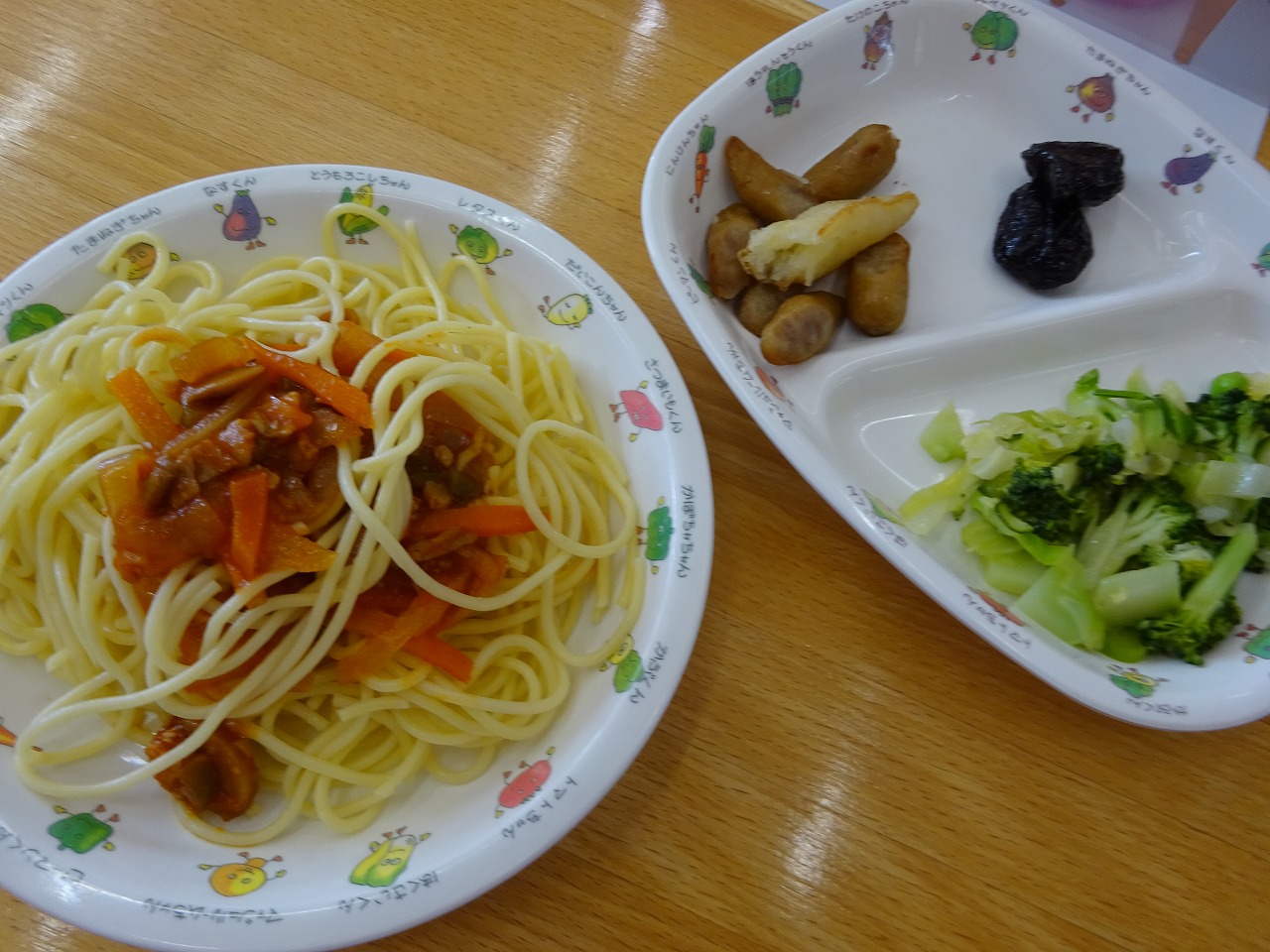 5月13日(木)給食 ・ナポリタンスパゲティ(パスタ・ベーコン・玉ねぎ・にんじん・ピーマン) ・グリーンサラダ(キャベツ・ブロッコリー・きゅうり・スナップえんどう) ・ウインナーポテト ・プルーン