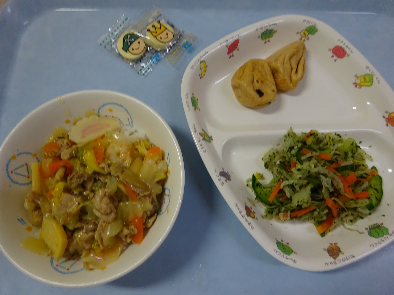 5月17日(月)給食 ・中華どんぶり(米・豚肉・えび・白菜・にんじん・竹の子・玉ねぎ・なると) ・もやしのかおりあえ(もやし・にんじん・キャベツ・きゅうり・かおり) ・がんもどきの煮物 ・チーズ