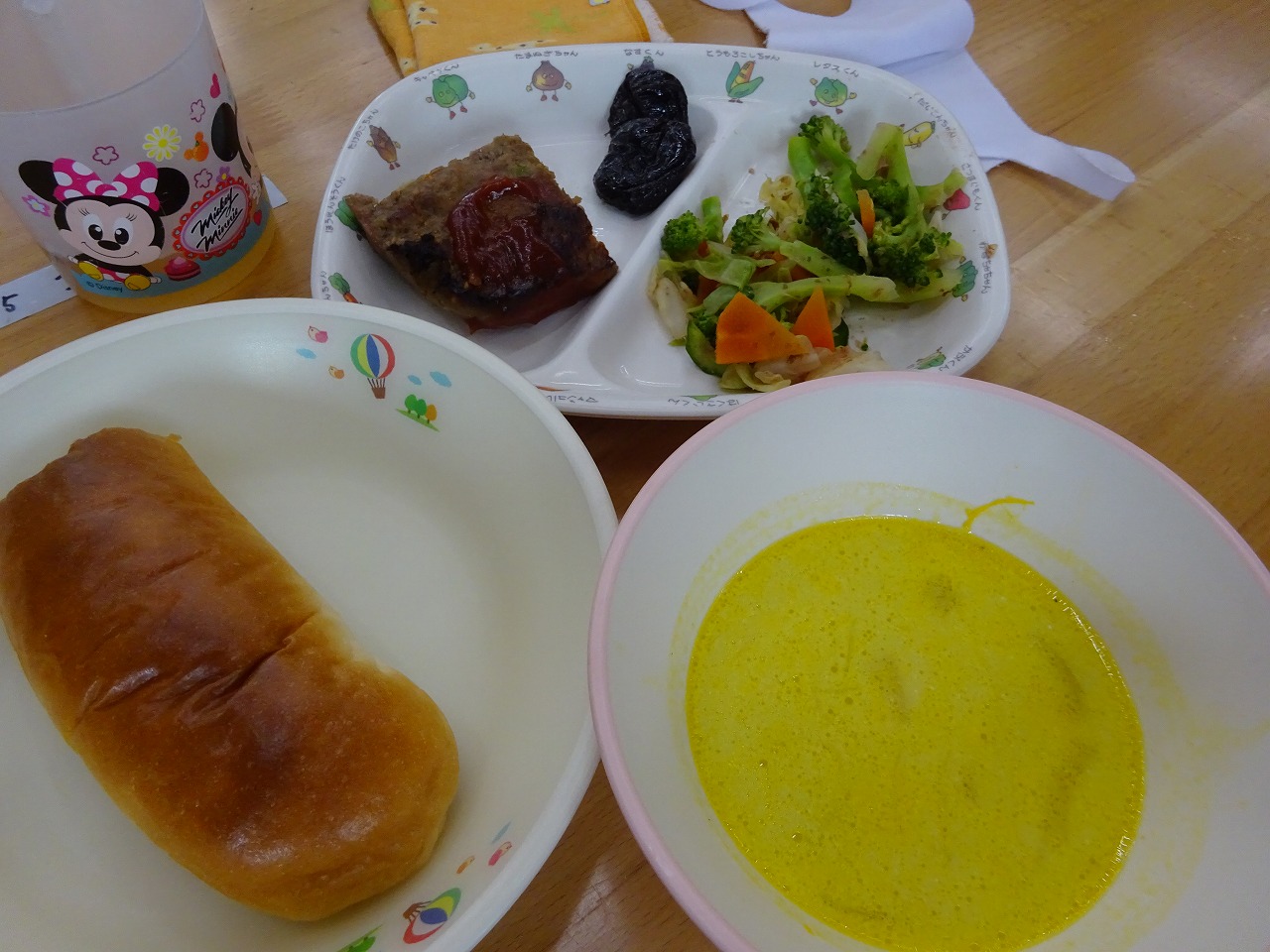 5月18日(火)給食 ・ロールパン ・ミートローフ(合挽肉・玉ねぎ・にんじん・コーン・グリンピース・卵・牛乳) ・おかかあえ(ブロッコリー・キャベツ・きゅうり・にんじん) ・かぼちゃポタージュ(かぼちゃ・玉ねぎ・バター・牛乳・生クリーム) ・プルーン