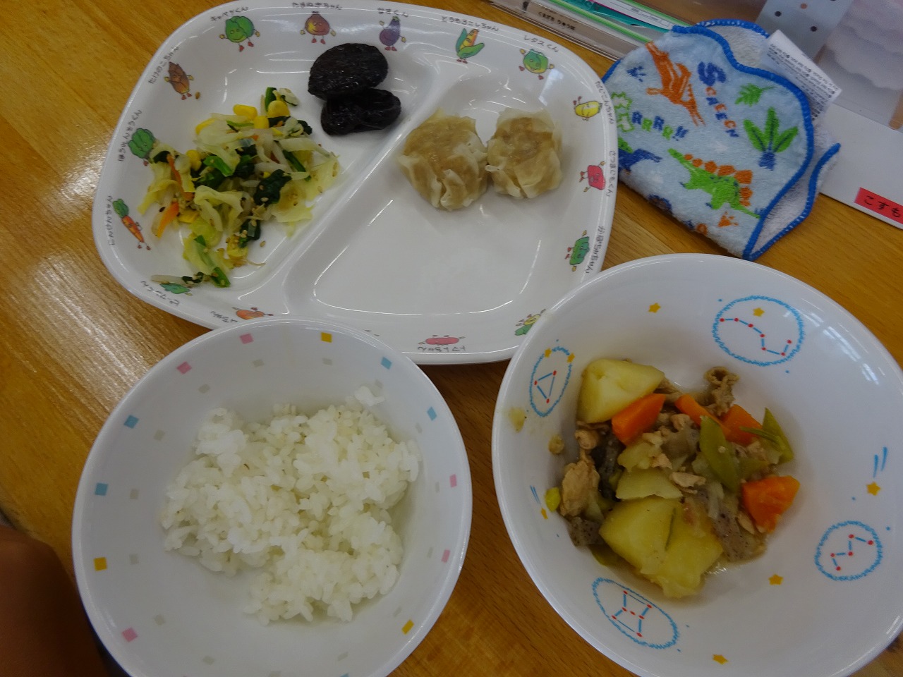 4月16日(金) ・ごはん ・肉じゃが(豚肉・じゃがいも・玉ねぎ・にんじん・こんにゃく) ・ほうれん草ナムル(ほうれん草・キャベツ・にんじん・もやし・コーン) ・豚肉しゅうまい ・プルーン