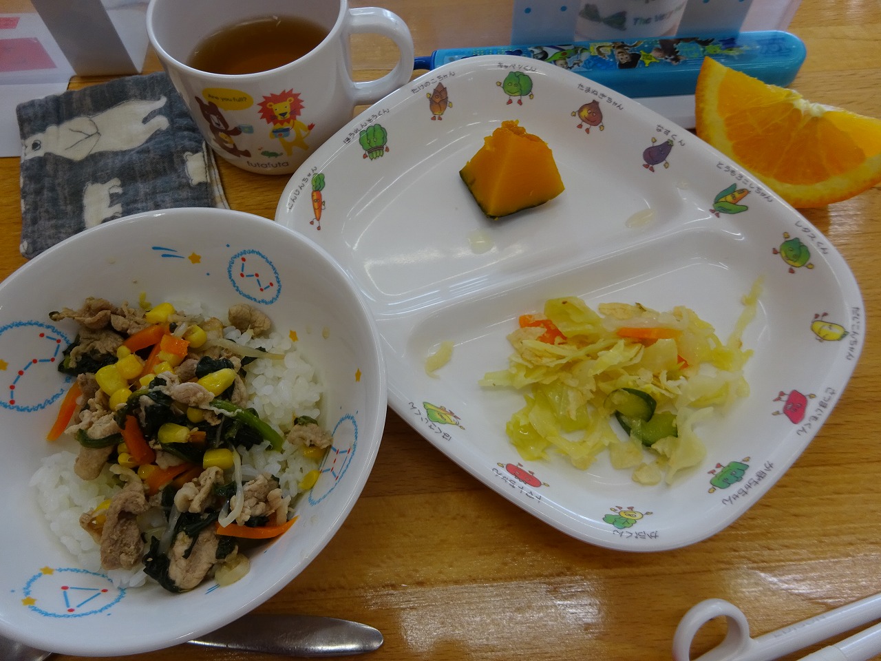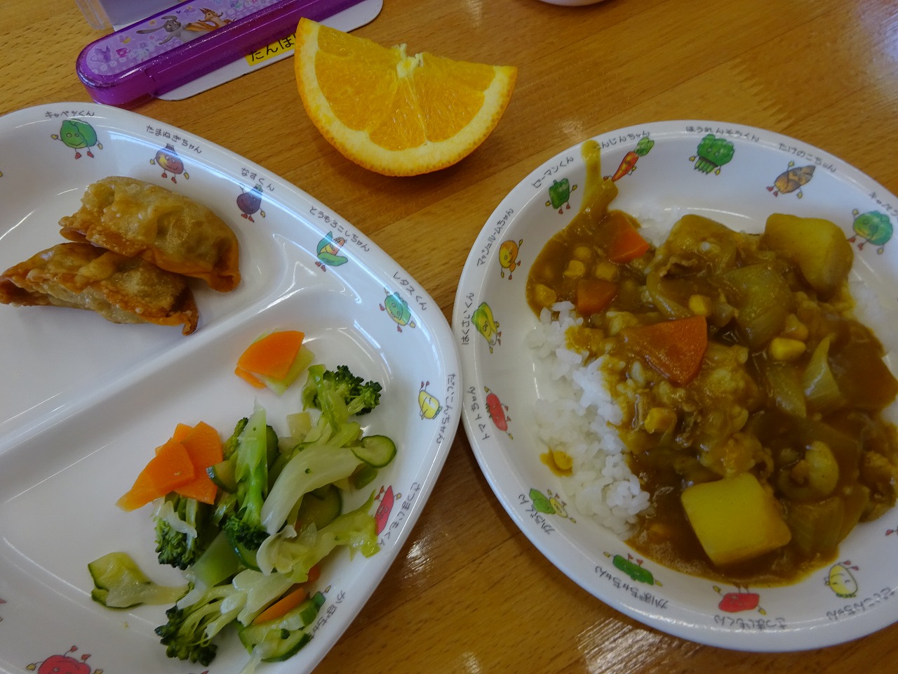 5月10日(月)給食 ・カレーライス(米・豚肉・じゃがいも・玉ねぎ・にんじん・コーン) ・キャベツの中華和え(キャベツ・きゅうり・にんじん・ブロッコリー) ・揚げギョウザ ・オレンジ