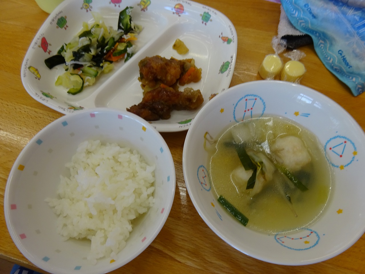 4月21日(水)給食 ・ごはん ・鶏肉とポテトの揚げ煮(鶏肉・ポテト・玉ねぎ・にんじん・ピーマン) ・きゅうりの酢の物(きゅうり・キャベツ・にんじん・しらす干し・わかめ) ・えびボールスープ(えびボール・もやし・コーン・はくさい・ニラ) ・チーズ