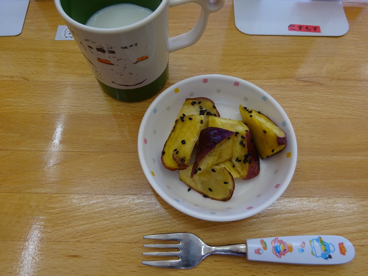4月26日(月)給食 おやつ ・ごはん ・肉豆腐(豚肉・焼き豆腐・玉ねぎ・こんにゃく・えのきたけ) ・かわりおひたし(ほうれん草・ツナ・キャベツ・にんじん・もやし) ・みそ汁(じゃがいも・玉ねぎ・にんじん・ねぎ・わかめ) ・バナナ おやつは、『大学いも』 さつまいも、三温糖、油と、ミツを三温糖・しょうゆ・水で作り、黒ごまをふりました。