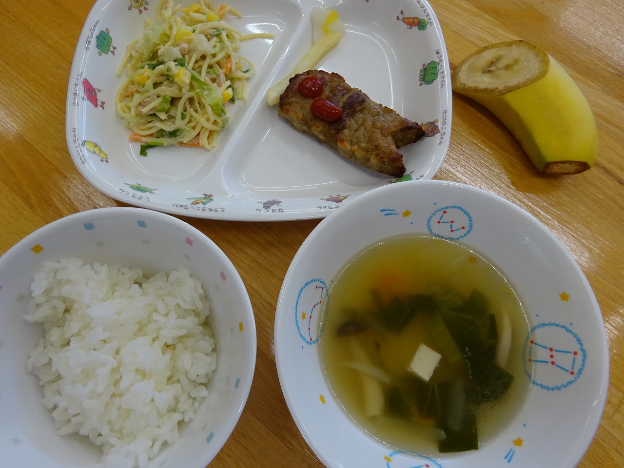 5月6日(木)給食 ・ごはん ・こいのぼりバーグ(ハンバーグ・ポテト・かまぼこ) ・スパゲティサラダ(サラスパ・ツナ・キャベツ・きゅうり・にんじん) ・しめじスープ(しめじ・豆腐・にんじん・チンゲン菜・玉ねぎ) ・バナナ
