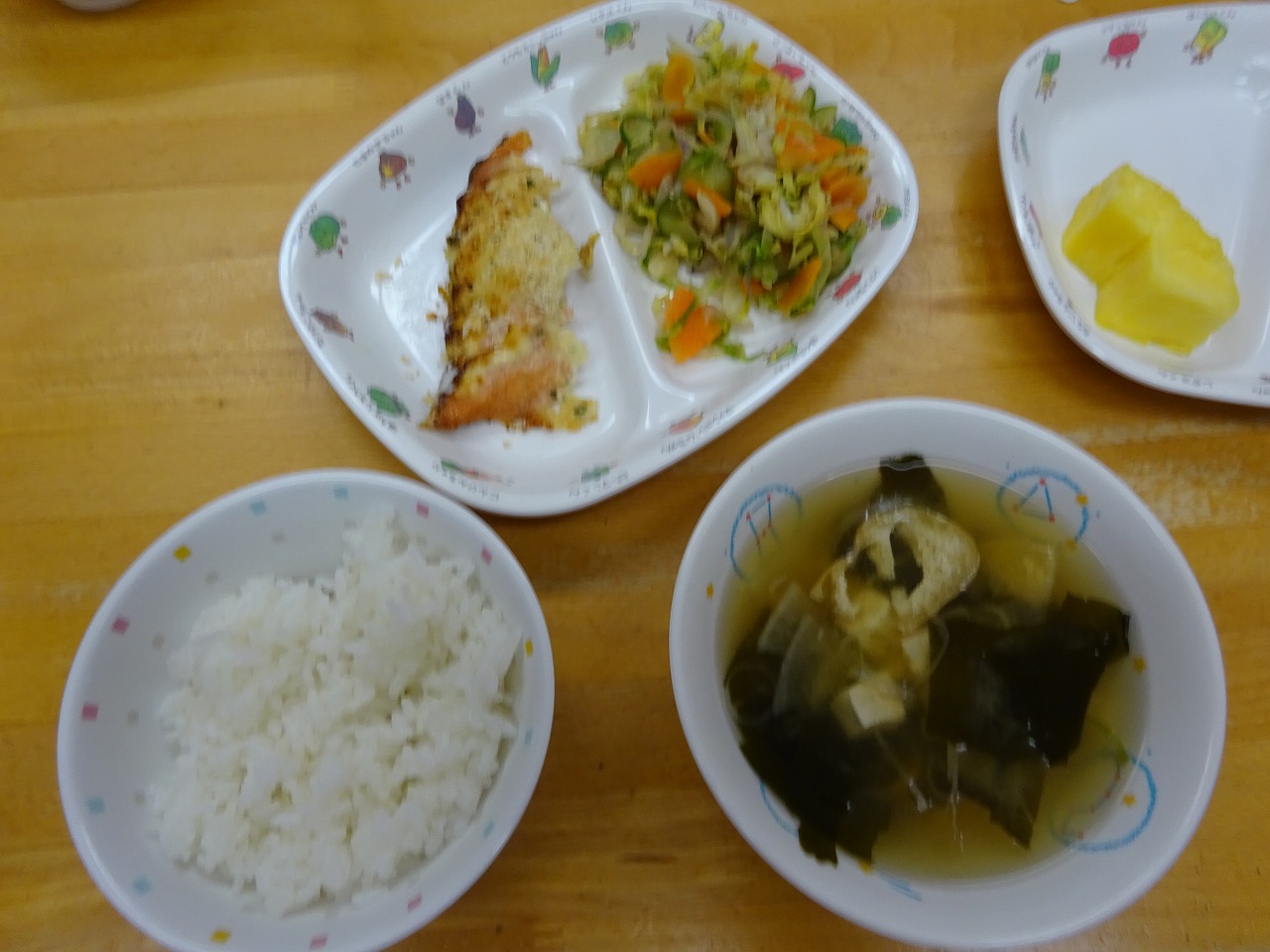 5月7日(金)給食 ・ごはん ・鮭のパン粉焼き(さけ・パセリ・粉チーズ) ・和風サラダ(キャベツ・きゅうり・にんじん・紫玉ねぎ) ・みそ汁(豆腐・油揚げ・だいこん・ねぎ・わかめ) ・パイナップル