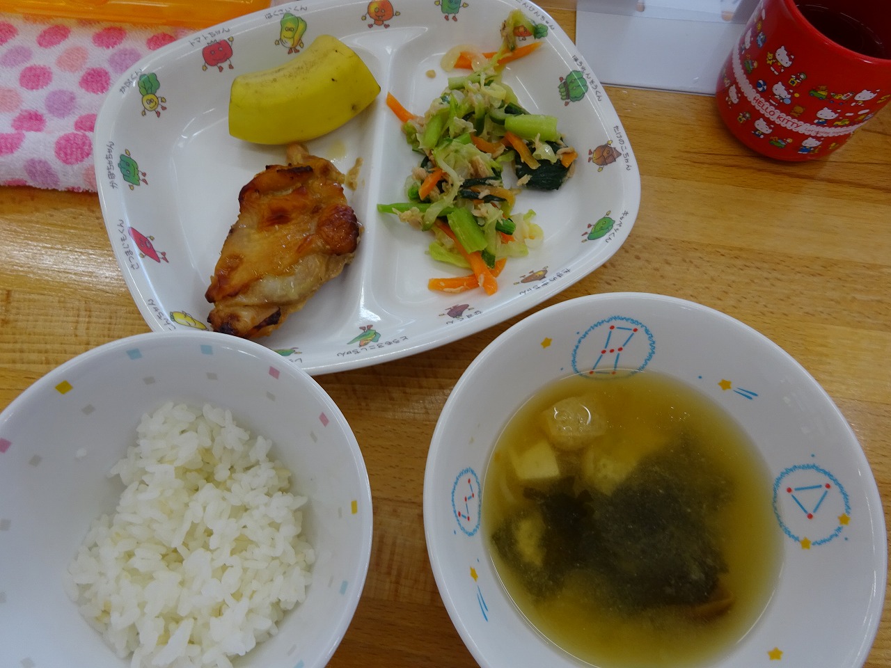 5月11日(火)給食 ・ごはん ・鶏肉の照り焼き ・小松菜サラダ(こまつな・にんじん・キャベツ・きゅうり・ツナ) ・みそ汁(豆腐・油揚げ・なめこ・ねぎ・わかめ) ・バナナ