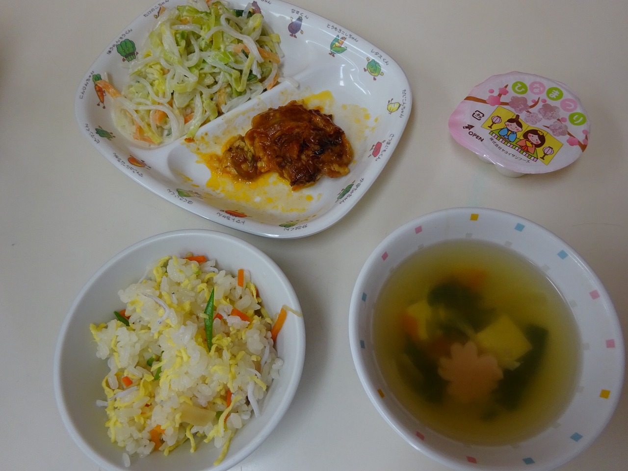 3月3日(水)給食 ・ちらし寿司(米・しらす・卵・れんこん・さやえんどう) ・鶏肉のピザ風焼き(鶏肉・玉ねぎ・ピーマン・チーズ・ピザソース) ・すまし汁(豆腐・玉ねぎ・にんじん・かまぼこ・みつば) ・ゼリー