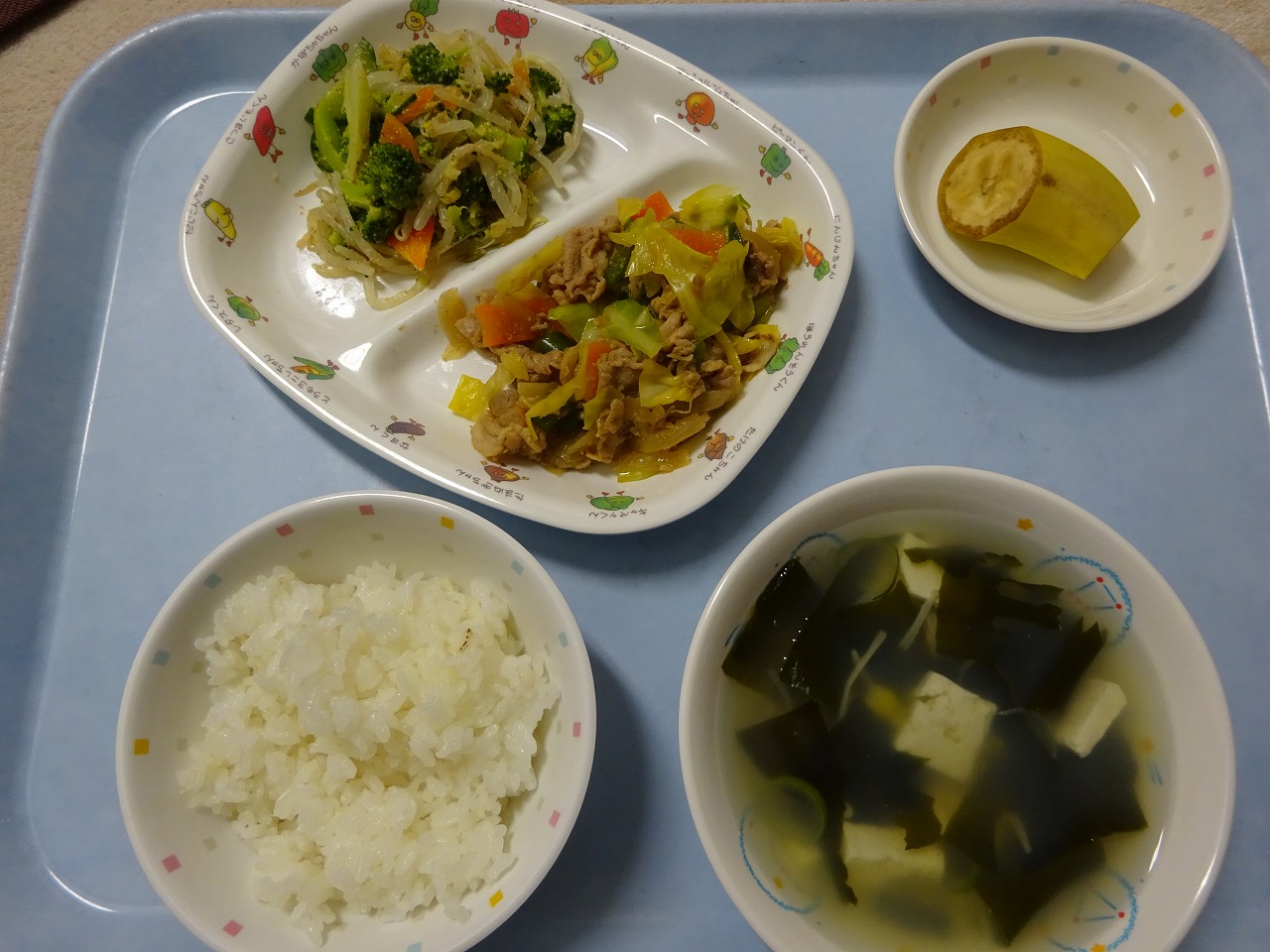 3月4日(木)給食 ・ごはん ・ホイコーロー(豚肉・キャベツ・にんじん・ピーマン・玉ねぎ) ・ブロッコリーごまあえ(ブロッコリー・きゅうり・もやし・にんじん・ごま) ・わかめスープ(わかめ・豆腐・えのきたけ・コーン・ねぎ) ・バナナ