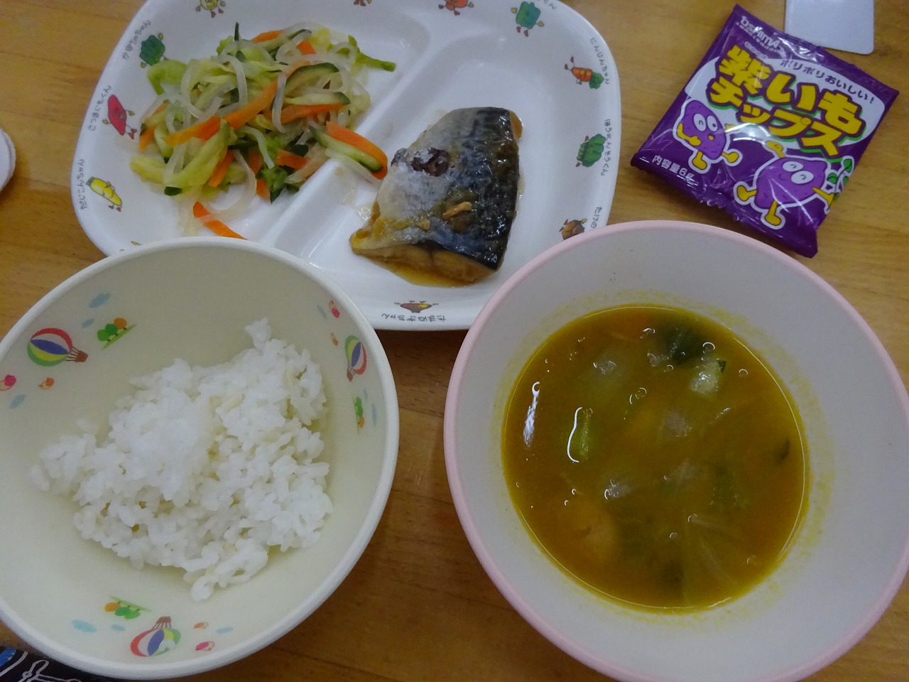3月9日(火)給食 ・ごはん ・さばのみぞれ煮 ・キャベツの中華和え(キャベツ・にんじん・きゅうり・ブロッコリー) ・カレースープ(ウインナー・玉ねぎ・にんじん・しめじ・ちんげん菜) ・紫いもチップス