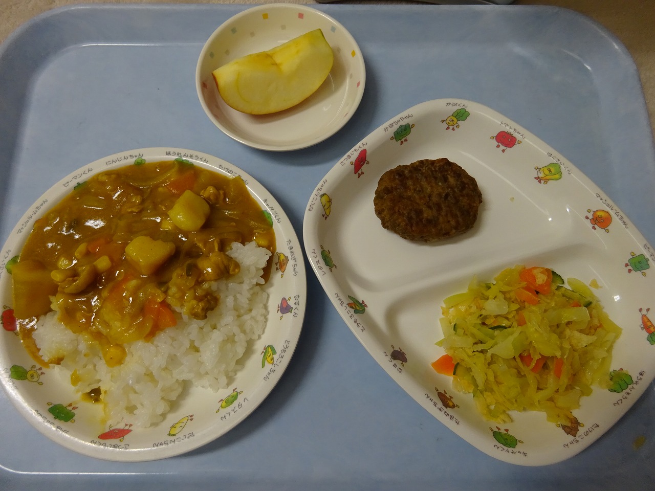 3月17日(水)給食 ・カレーライス(米・豚肉・じゃがいも・玉ねぎ・にんじん・ピーマン・コーン) ・ハンバーグ ・チップスサラダ(キャベツ・きゅうり・にんじん・ポテトチップス) ・りんご