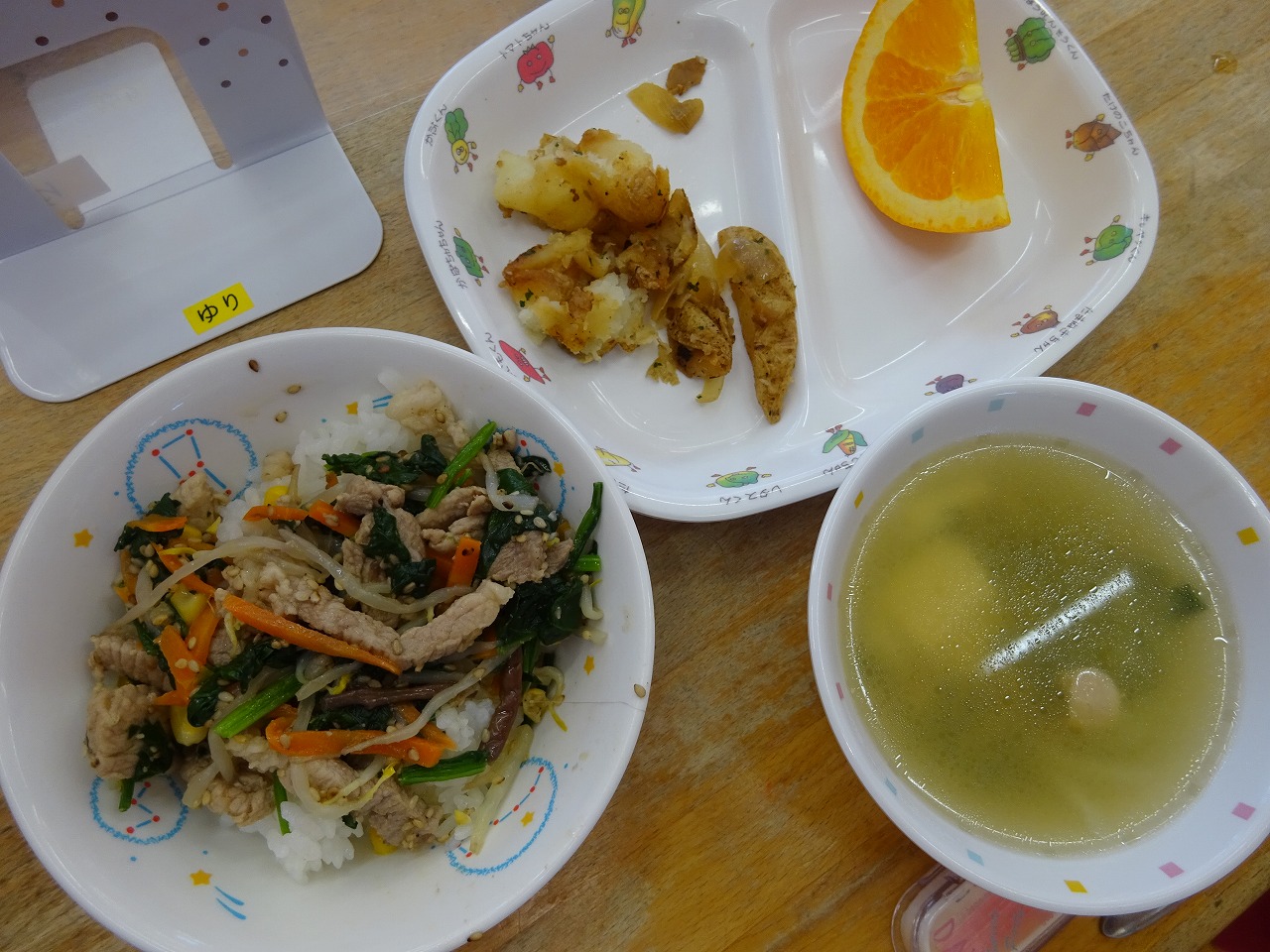11月5日(木)給食 ・ビビンバ(米・豚肉・ほうれん草・もやし・にんじん・ぜんまい・コーン) ・ジャーマンポテト(ポテト・ベーコン・玉ねぎ・パセリ) ・チキンスープ(鶏肉・玉ねぎ・えのきたけ・ニラ・豆腐) ・オレンジ