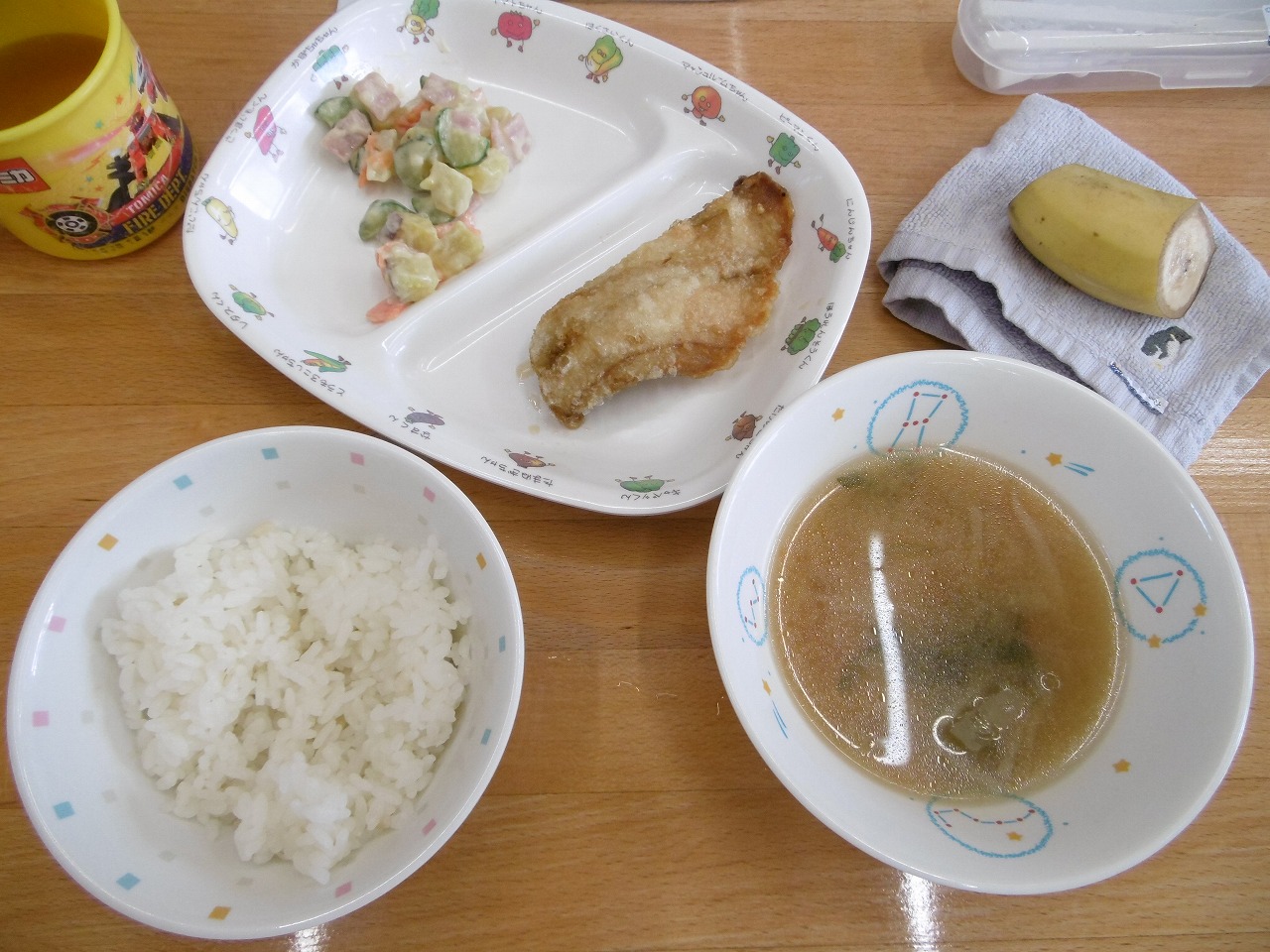 11月18日(水) 給食 ・ごはん ・チキン南蛮(鶏肉・卵・玉ねぎ・マヨドレ) ・五目あえ(ほうれん草・もやし・にんじん・油揚げ・しらたき・) ・みそ汁(豆腐・なめこ・玉ねぎ・みそ) ・バナナ