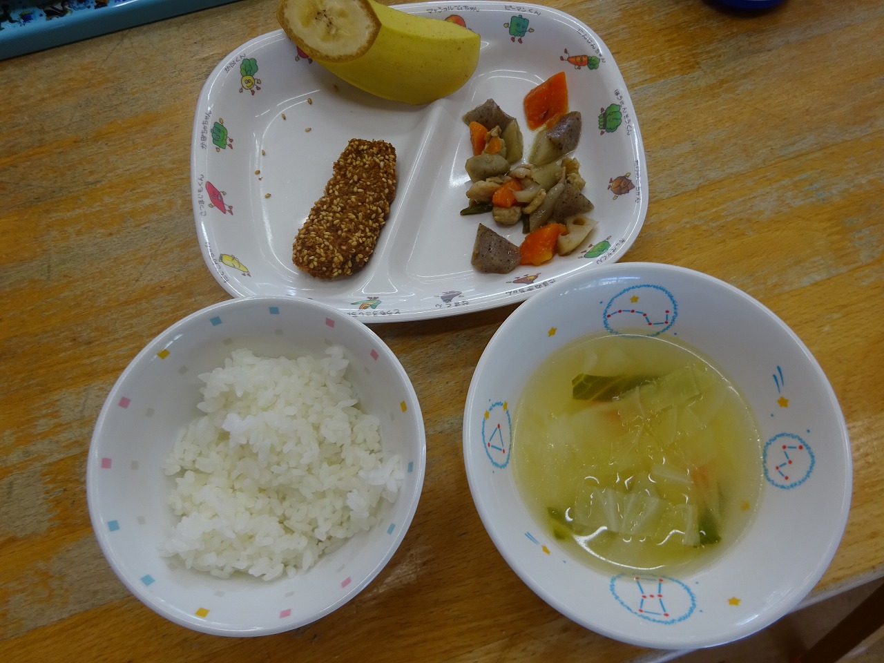 11月9日(月)給食 ・ごはん ・筑前煮(鶏肉・ごぼう・にんじん・れんこん・こんにゃく・いんげん) ・さんまのごま揚げ ・キャベツスープ(キャベツ・玉ねぎ・にんじん・コーン) ・バナナ