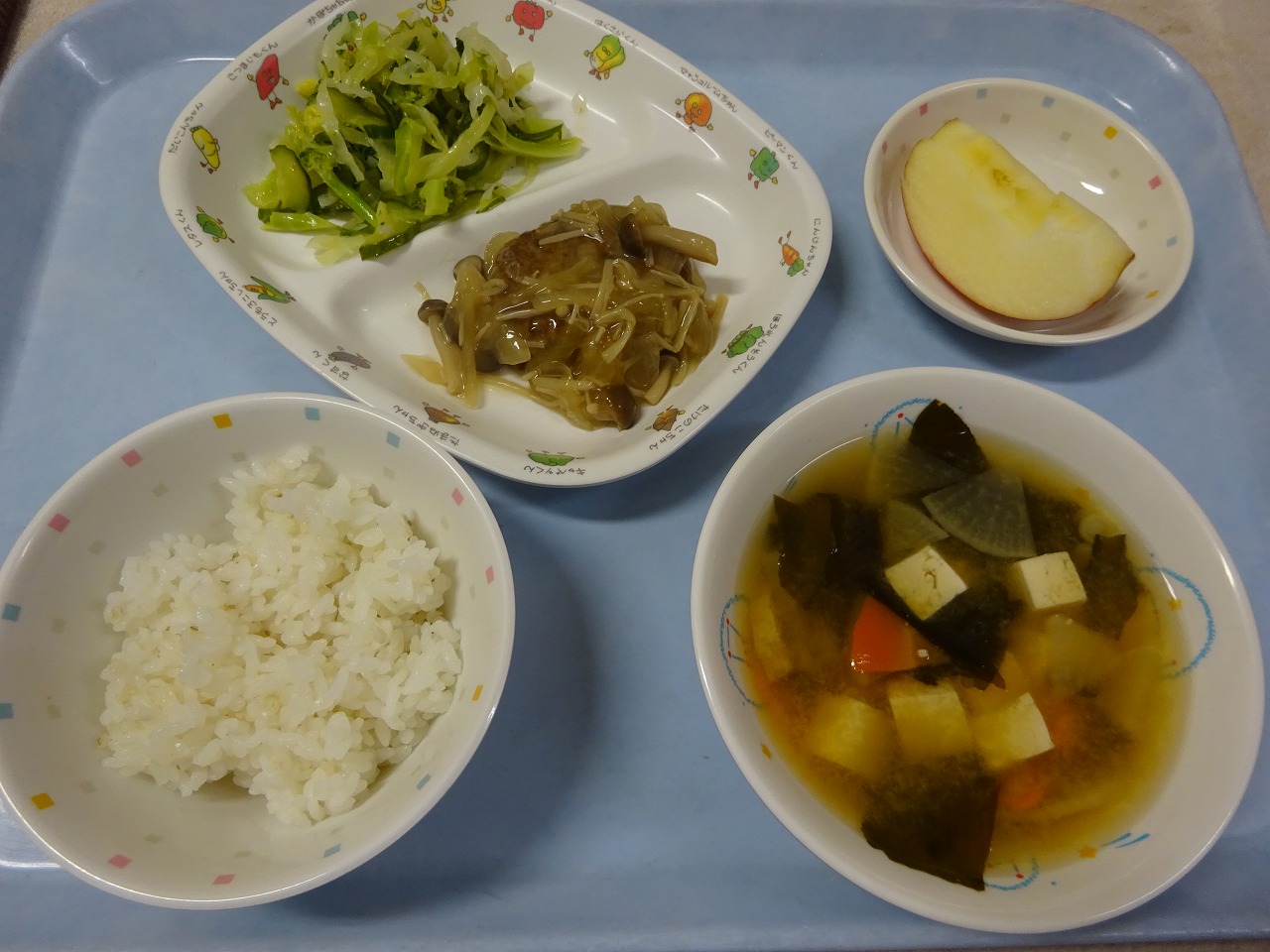 11月10日(火)給食 ・ごはん ・和風きのこハンバーグ(ハンバーグ・しめじ・えのきたけ・玉ねぎ) ・グリーンサラダ(ブロッコリー・キャベツ・きゅうり) ・みそ汁(豆腐・油揚げ・だいこん・にんじん・ねぎ) ・りんご