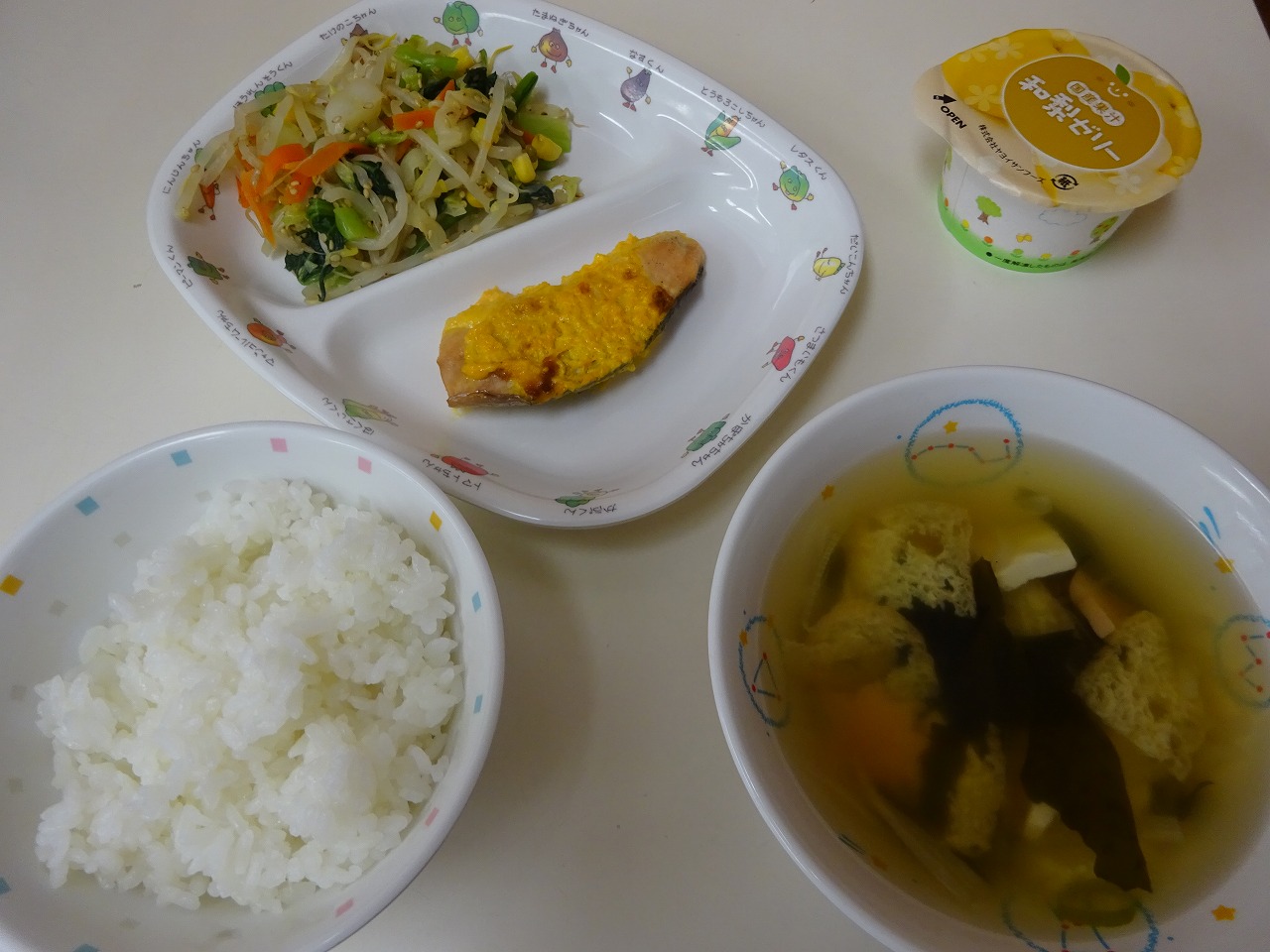 11月13日(金)給食 ・ごはん ・鮭のもみじ焼き(鮭・にんじん・マヨドレ) ・もやしのナムル(もやし・こまつな・キャベツ・にんじん・コーン) ・すまし汁(豆腐・油揚げ・玉ねぎ・かまぼこ・ねぎ) ・和梨ゼリー