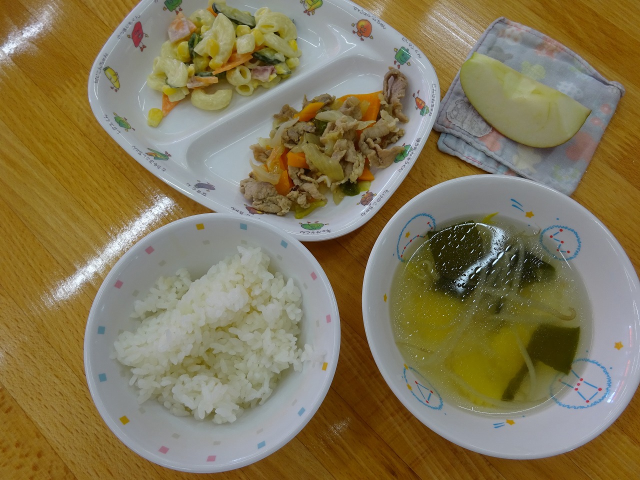 9月2日(水)給食 ・ごはん ・豚肉のしょうが焼き(豚肉・キャベツ・玉ねぎ・にんじん・ピーマン・しょうが) ・マカロニサラダ(マカロニ・きゅうり・にんじん・ハム・コーン・マヨドレ) ・もやしスープ(もやし・玉ねぎ・しめじ・わかめ) ・りんご