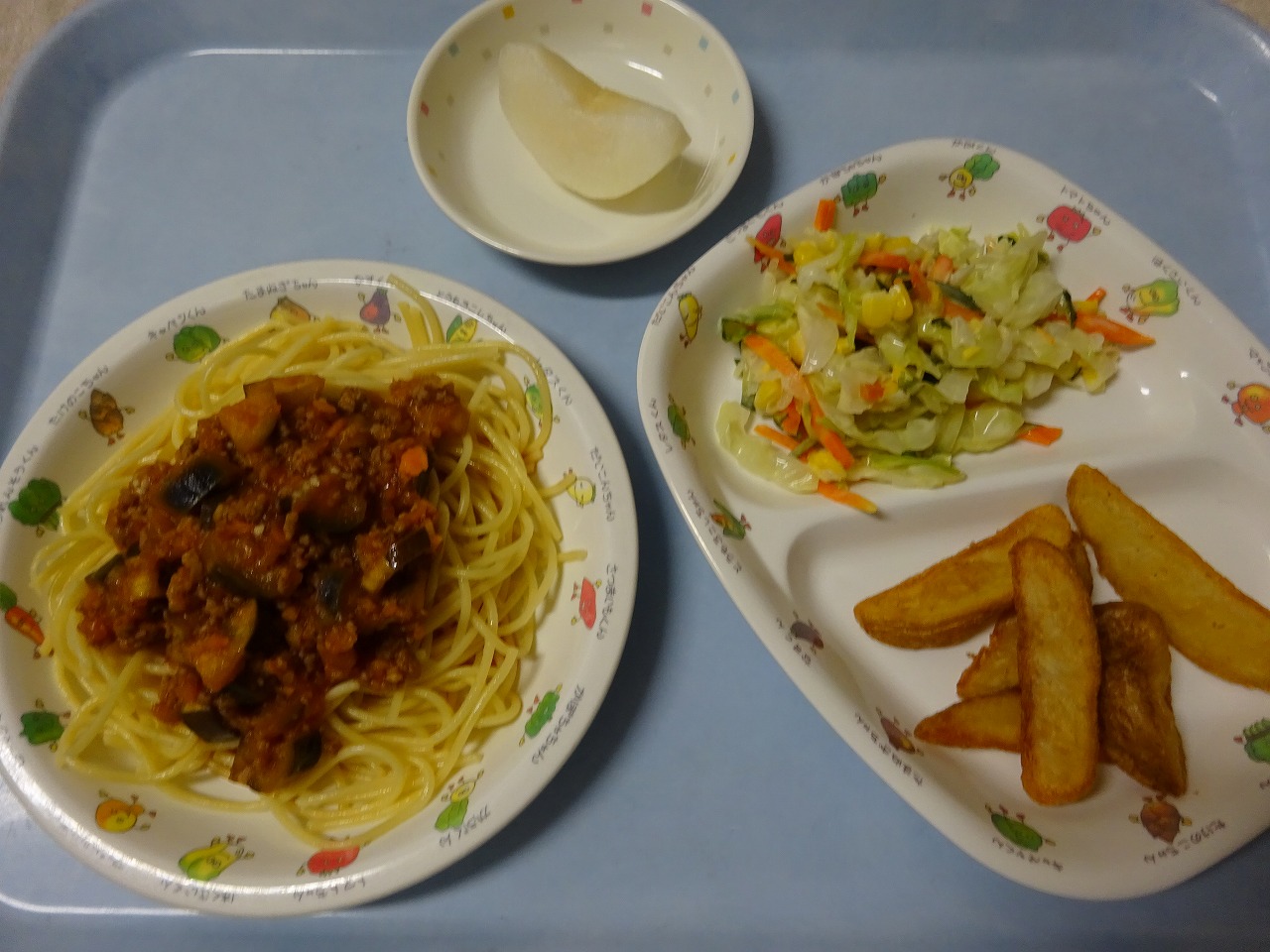 9月4日(金)給食 ・なすのボロネーゼ(パスタ・豚挽肉・なす・玉ねぎ・にんじん) ・コールスローサラダ(キャベツ・きゅうり・にんじん・コーン・マヨドレ) ・コンソメポテト ・なし