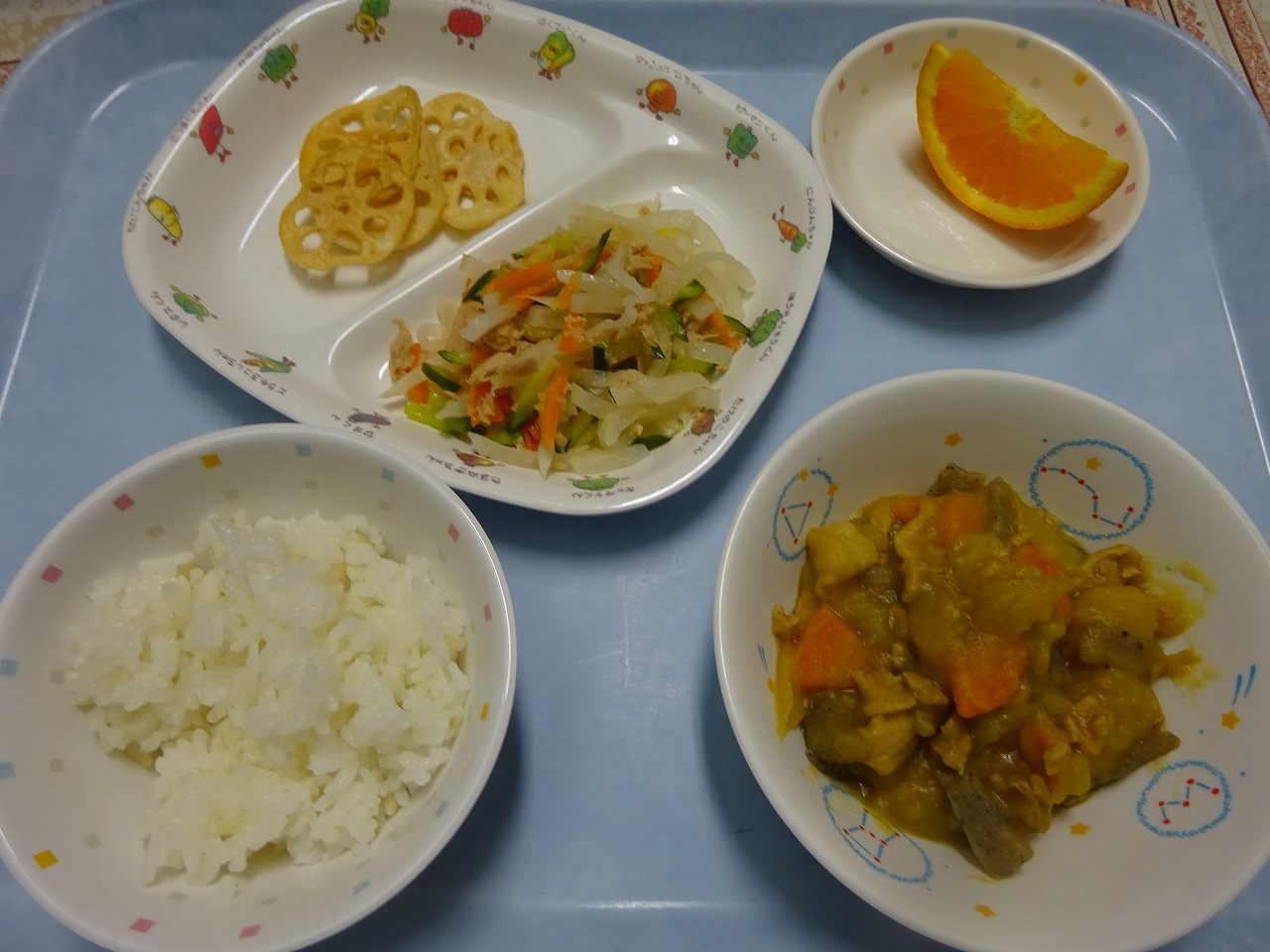 9月8日(月)給食 と おやつ ・ごはん ・カレー肉じゃが(豚肉・じゃがいも・玉ねぎ・にんじん・こんにゃく) ・だいこんサラダ(だいこん・きゅうり・にんじん・ツナ) ・れんこんチップス ・オレンジ 今日のおやつは、『カルピス蒸しパン』