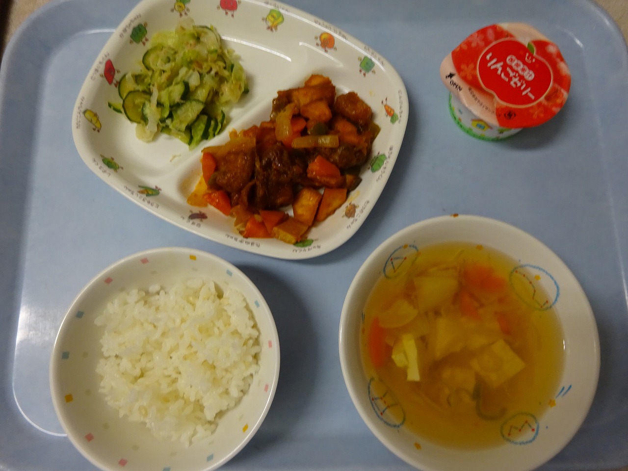 9月15日(火)給食 ・ごはん ・酢豚(豚肉・にんじん・玉ねぎ・ピーマン・さつまいも・たけのこ) ・グリーンサラダ(キャベツ・きゅうり・ブロッコリー) ・すまし汁(豆腐・えのきたけ・玉ねぎ・にんじん・ねぎ) ・りんごゼリー