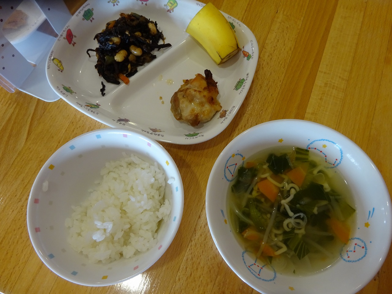 9月16日(水)給食 ・ごはん ・鶏肉のスタミナ焼き(鶏肉・しょうが・にんにく) ・ひじきの煮物(ひじき・大豆・油揚げ・にんじん・いんげん) ・ABCスープ(マカロニ・にんじん・玉ねぎ・もやし・ちんげん菜・ねぎ) ・バナナ