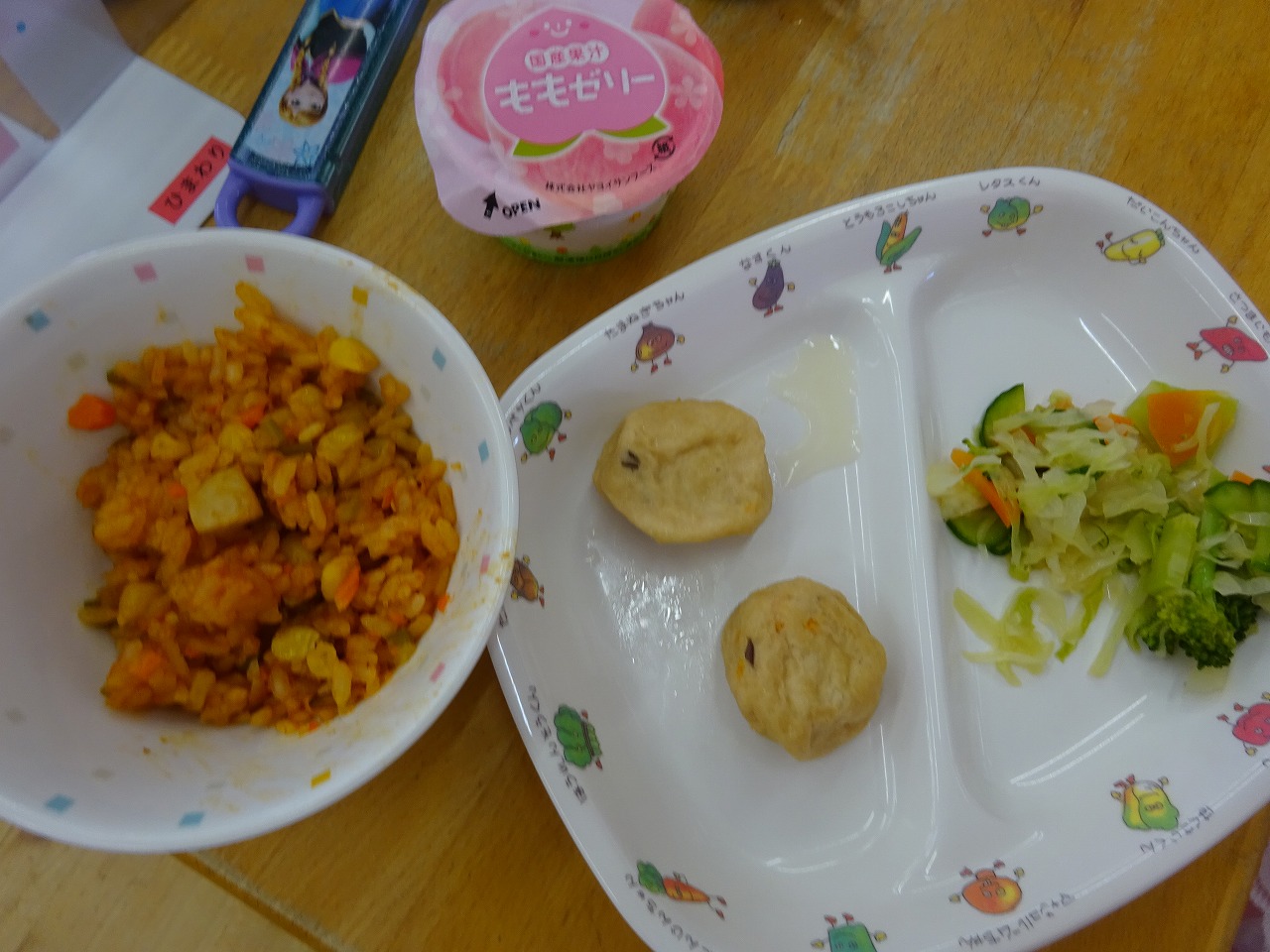 8月31日(月)給食 ・ケチャップライス(米・鶏肉・玉ねぎ・にんじん・ピーマン・コーン) ・ブロッコリー中華あえ(ブロッコリー・キャベツ・きゅうり・にんじん) ・がんもどきの煮物 ・ももゼリー