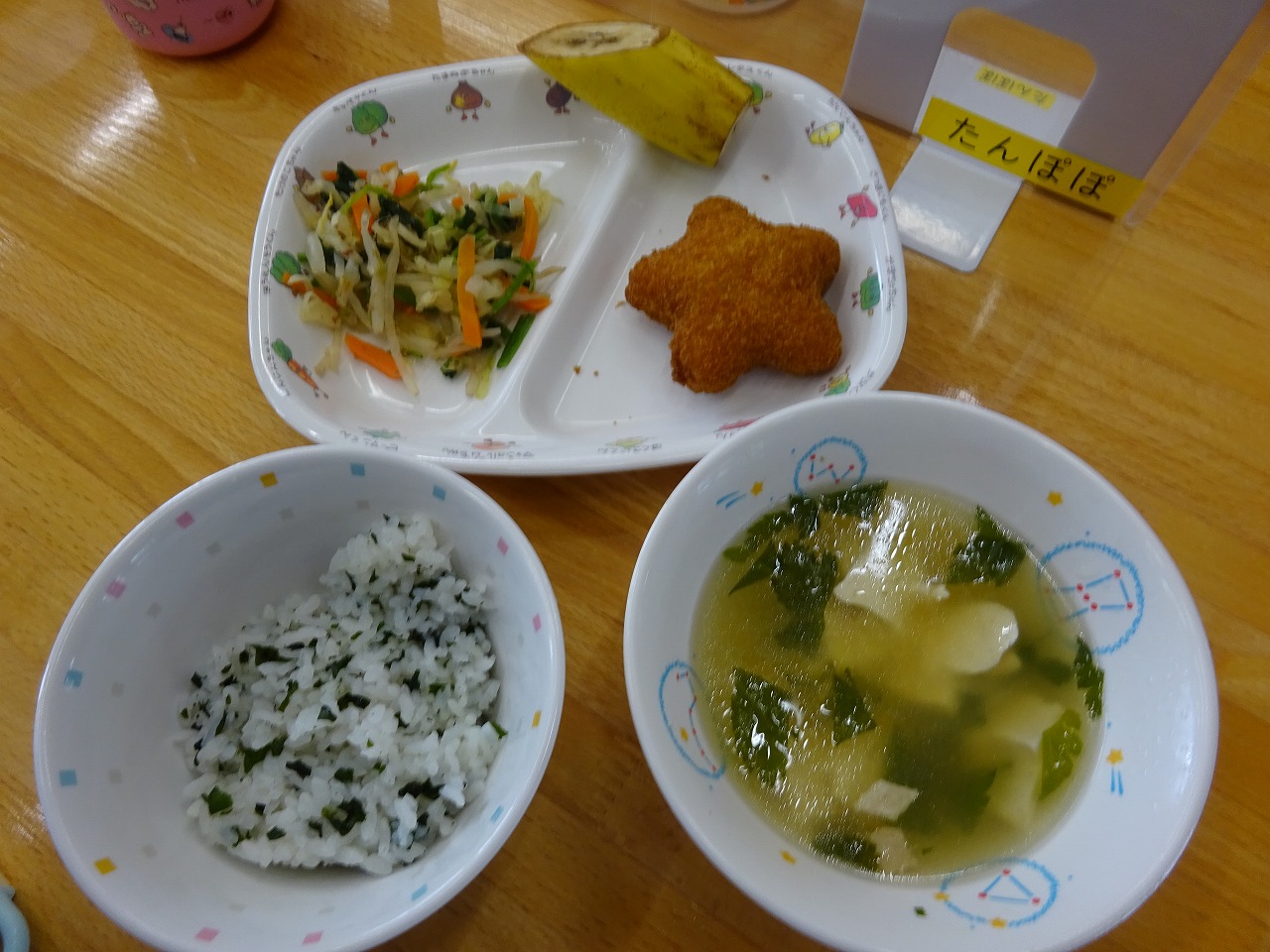 9月1日(火)給食・わかめごはん(米・わかめ) ・星のコロッケ ・ほうれん草のおひたし(ほうれん草・キャベツ・もやし・にんじん) ・すまし汁(豆腐・鶏肉・玉ねぎ・みつば) ・バナナ