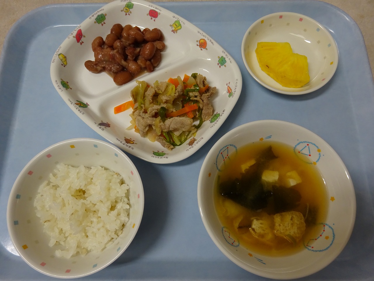 6月4日(木)給食 ・ごはん ・豚肉のしょうが焼き(豚肉・玉ねぎ・キャベツ・にんじん・ピーマン・生姜) ・金時豆の甘煮 ・みそ汁(豆腐・油揚げ・じゃがいも・ねぎ・わかめ・みそ) ・パイナップル ・