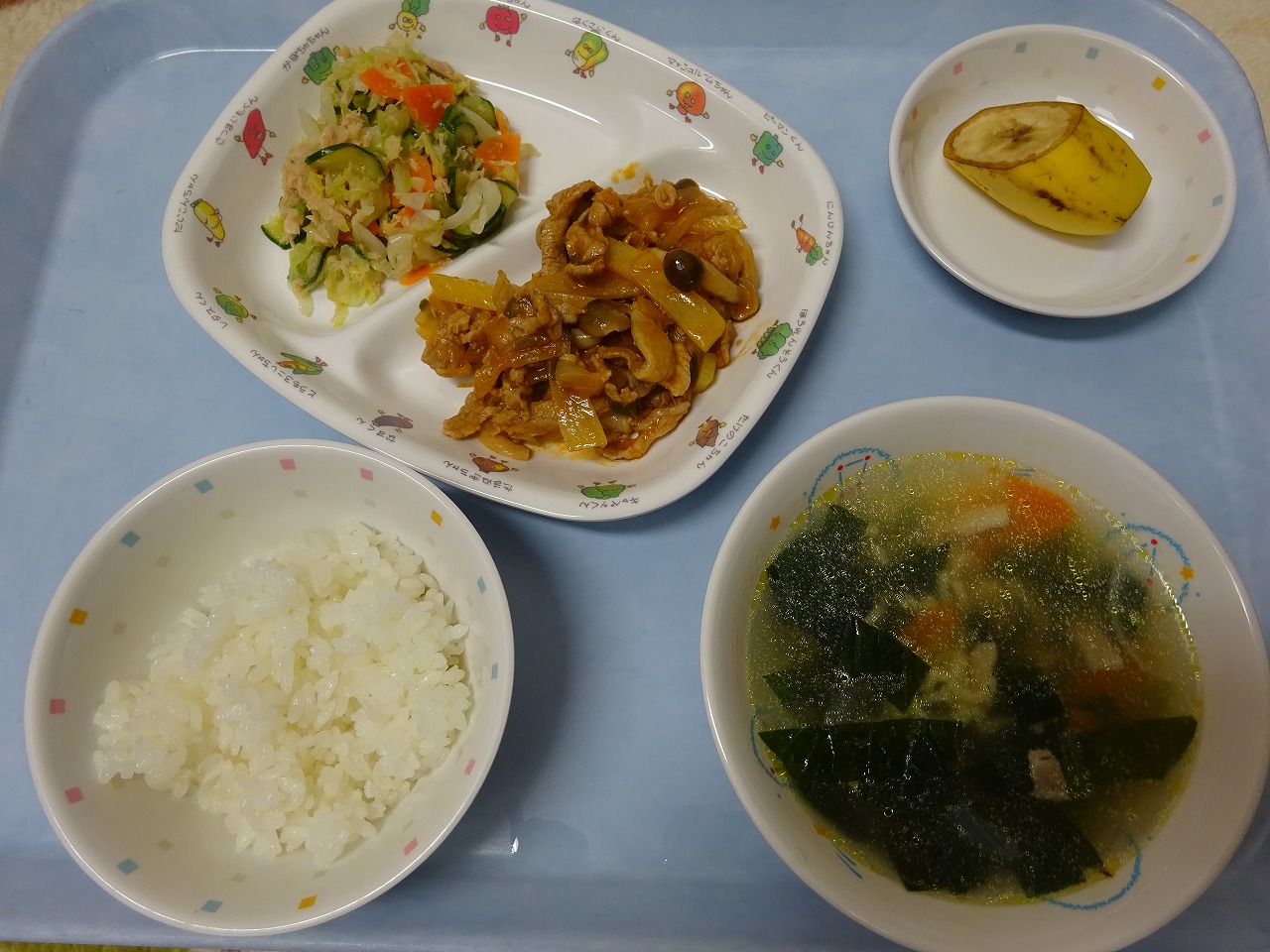 6月8日(月)給食 ・ごはん ・ポークケチャップ(豚肉・じゃがいも・玉ねぎ・しめじ・ピーマン・ケチャップ) ・キャベツサラダ(キャベツ・きゅうり・にんじん・ツナ) ・ABCスープ(マカロニ・玉ねぎ・にんじん・こまつな) ・バナナ