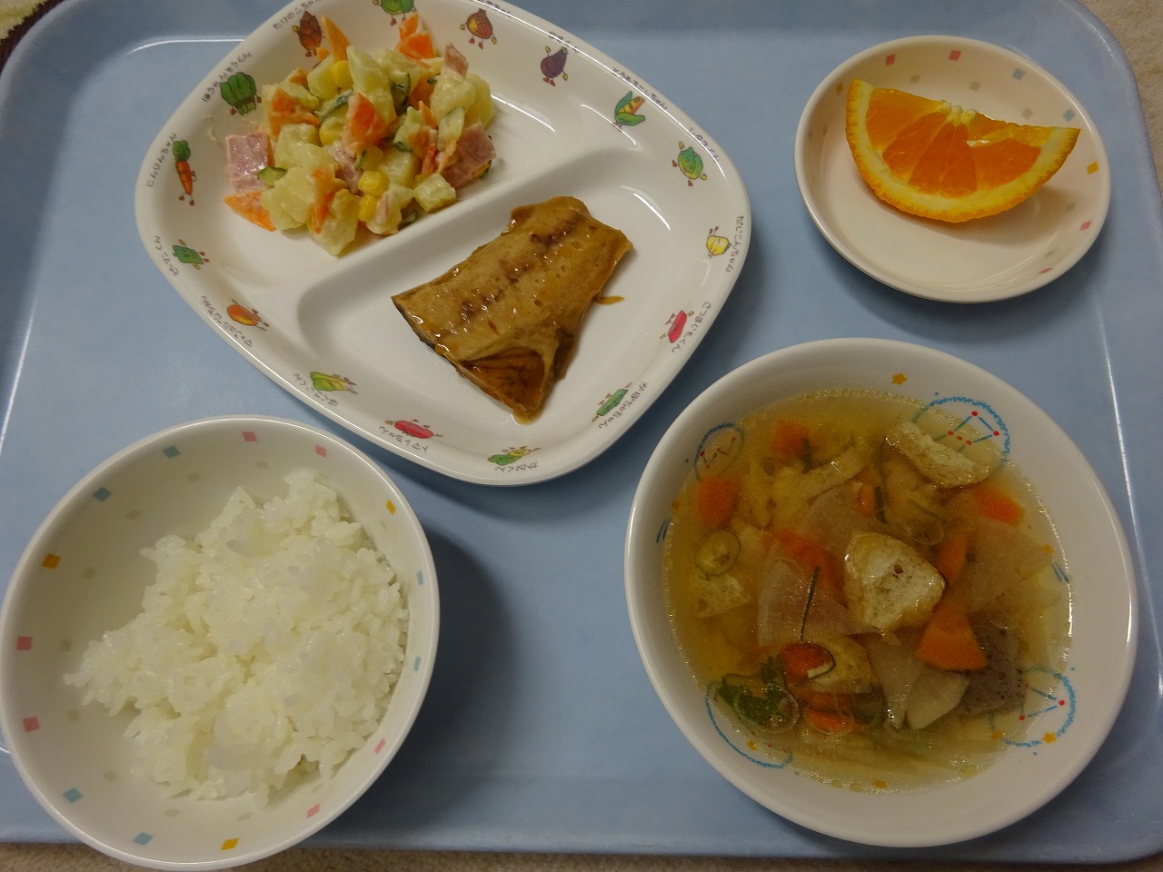 6月9日(火)給食 ・ごはん ・さばのみそ煮 ・ポテトサラダ(じゃがいも・きゅうり・にんじん・ハム・コーン・マヨ) ・ごもく汁(鶏肉・だいこん・にんじん・こんにゃく・ねぎ) ・オレンジ