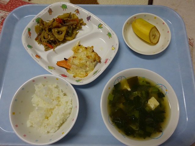 2月5日(水)給食 ・ごはん ・鮭のマヨドレ焼き(鮭・玉ねぎ・マヨドレ) ・五目きんぴら(ごぼう・れんこん・にんじん・こんにゃく・油揚げ・いんげん) ・みそ汁(豆腐・こまつな・さといも・ねぎ・わかめ・みそ) ・バナナ