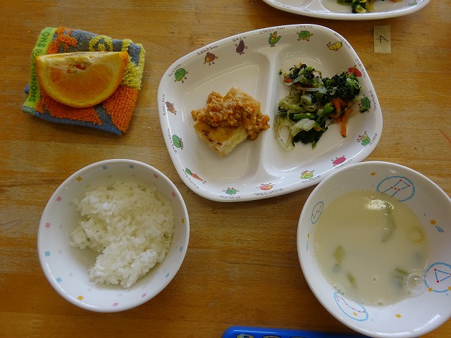 2月6日(木)給食 ・ごはん ・焼き豆腐の鶏みそかけ(焼き豆腐・鶏挽き肉・にんじん・玉ねぎ・みそ) ・白菜の磯あえ(はくさい・ほうれん草・にんじん・もやし・焼きのり) ・豆乳スープ(じゃがいも・ベーコン・ちんげん菜・ねぎ) ・いよかん