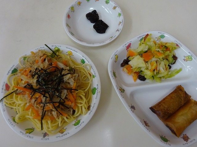 2月7日(金)給食 ・和風スパゲティ(麺・ツナ・えのきたけ・しめじ・玉ねぎ・ピーマン・にんじん・きざみのり) ・キャベツとりんごのサラダ(キャベツ・りんご・きゅうり・にんじん・干しぶどう) ・ミニはるまき ・プルーン