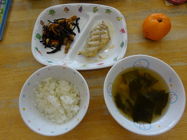 2月10日(月) 給食 ・ごはん ・さわらのごまだれかけ(さわら・ごま) ・ひじきと大豆の煮物(ひじき・大豆・にんじん・ちくわ・いんげん) ・みそ汁(じゃがいも・油揚げ・玉ねぎ・しめじ・わかめ・みそ) ・みかん