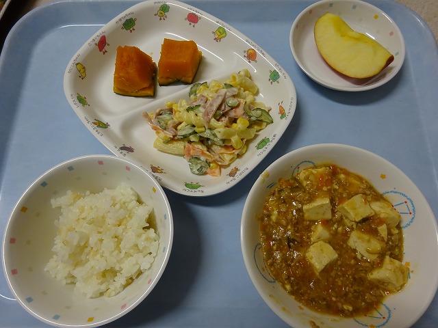 2月12日(水)給食 ・ごはん ・マーボ豆腐(豆腐・豚挽き肉・ねぎ・にんじん・干ししいたけ・みそ) ・マカロニサラダ(マカロニ・ハム・きゅうり・にんじん・コーン・マヨドレ) ・かぼちゃ甘煮 ・りんご
