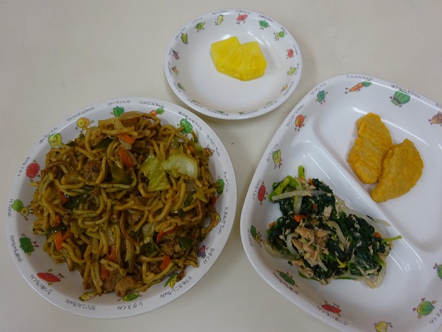 2月13日(木)給食 ・焼きそば(麺・豚肉・キャベツ・にんじん・玉ねぎ・ピーマン) ・かわりおひたし(ほうれん草・ツナ・キャベツ・にんじん・もやし) ・チキンナゲット ・パイナップル