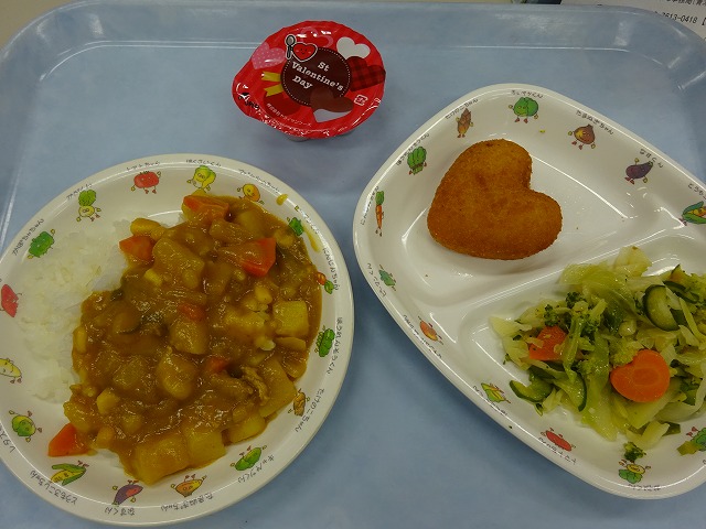2月14日(金)給食 ・カレーライス(米・豚肉・じゃがいも・玉ねぎ・にんじん・ピーマン・コーン) ・ブロッコリーサラダ(ブロッコリーサラダ・キャベツ・きゅうり・にんじん) ・ハートのコロッケ ・いちごのハートカップ