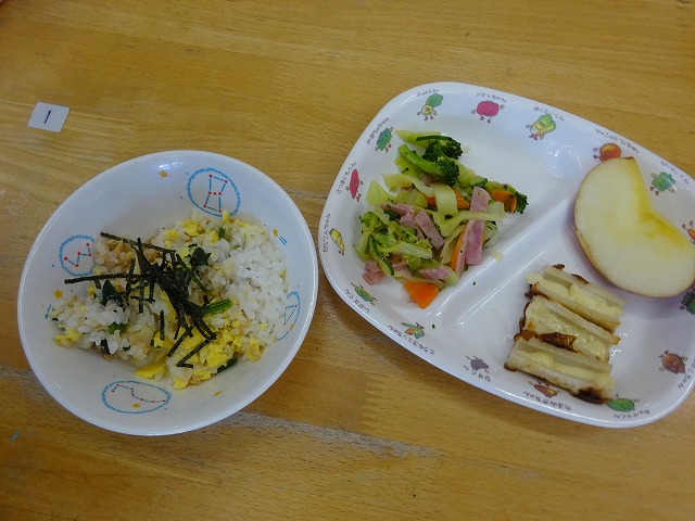 2月17日(月)給食 ・三色どんぶり(米・ツナ・卵・ほうれん草・きざみのり) ・ハムサラダ(ハム・キャベツ・ブロッコリー・きゅうり・にんじん) ・ちくわのマヨ焼き(ちくわ・マヨドレ) ・りんご