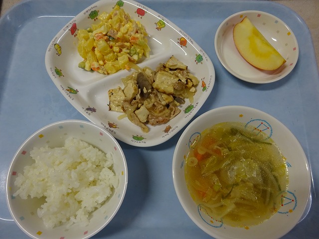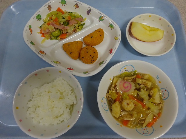 12月2日(月)給食 ・ごはん ・八宝菜(豚肉・えび・いか・白菜・にんじん・玉ねぎ・なると・たけのこ) ・中華サラダ(キャベツ・きゅうり・にんじん・ハム) ・おさつスナックフライ ・りんご
